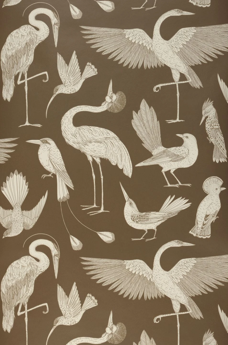 Die ganze Vielfalt der Vogelwelt bringt die dänische Designerfirma Ferm Living auf eine hochwertige Vliestapete. Detailgetreu und lebensnah dargestellt, finden sich die verschiedensten Vögel von eleganten Kranichen über Paradiesvögel mit ihren auffälligen Schwanzfedern bis hin zu flinken Kolibris. Ruhe entsteht in der Fülle durch den schlicht olivbraunen Grund der Tapete und das Cremeweiß und Grünbraun der Vögel. So passt „Birds of Happiness“ perfekt zu einer Vielzahl von Einrichtungsstilen.
