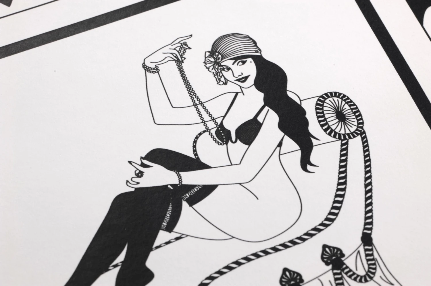Lass uns träumen – von den Goldenen Zwanzigern mit ihrer Frauenpower. Flapper-Girls, Burlesque-Tänzerinnen, Pin-ups, rauschende Tanznächte in prunkvollen Salons oder Musiktheatern. Den unergründlichen Reiz dieser glamourösen Welt spiegelt die Mustertapete mit kunstvoll gerahmten Schönheiten und in Schwarz-Weiß gezeichnet wunderbar wieder.