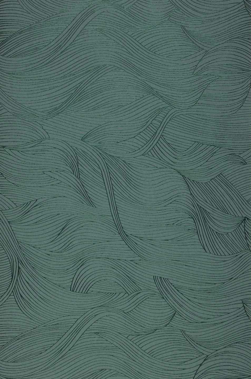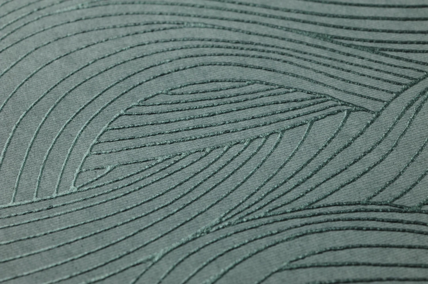 Beinahe Ton in Ton sind der mintgrüne Untergrund und die dunkelgrün schimmernde Musterfarbe, die in fühlbar erhabenen Linien auf die Tapete aufgetragen wurde. Die Höhenunterschiede betonen das Wellenmuster, das aus den geschwungenen Linien entsteht. Blickt man aus etwas Entfernung auf die reizvolle Vliestapete, meint man das dreidimensionale Auf und Ab einer Hügellandschaft zu erkennen.