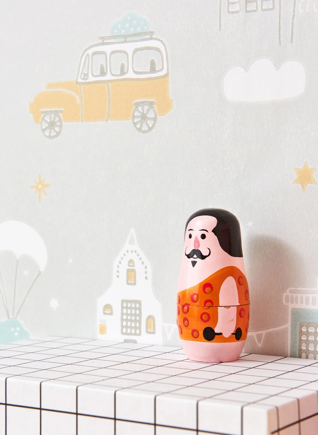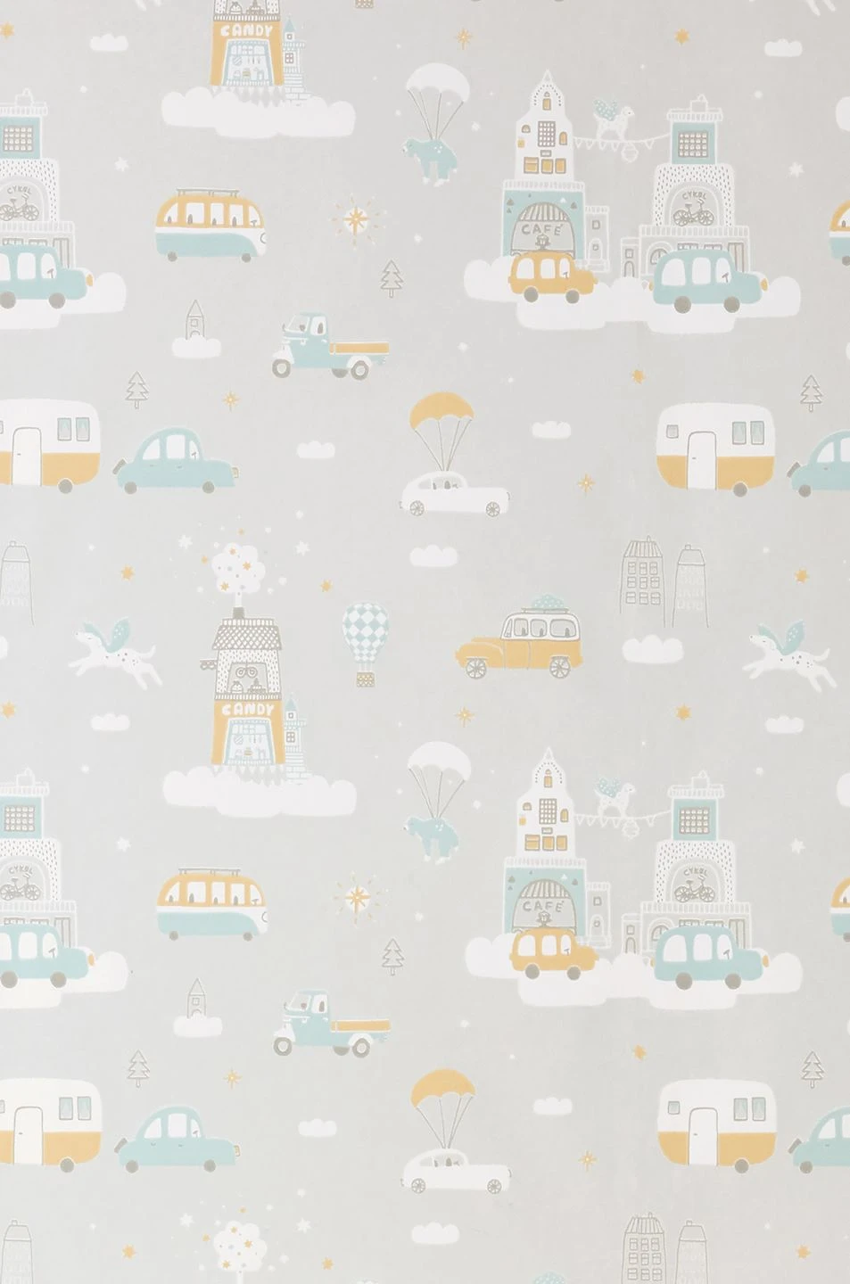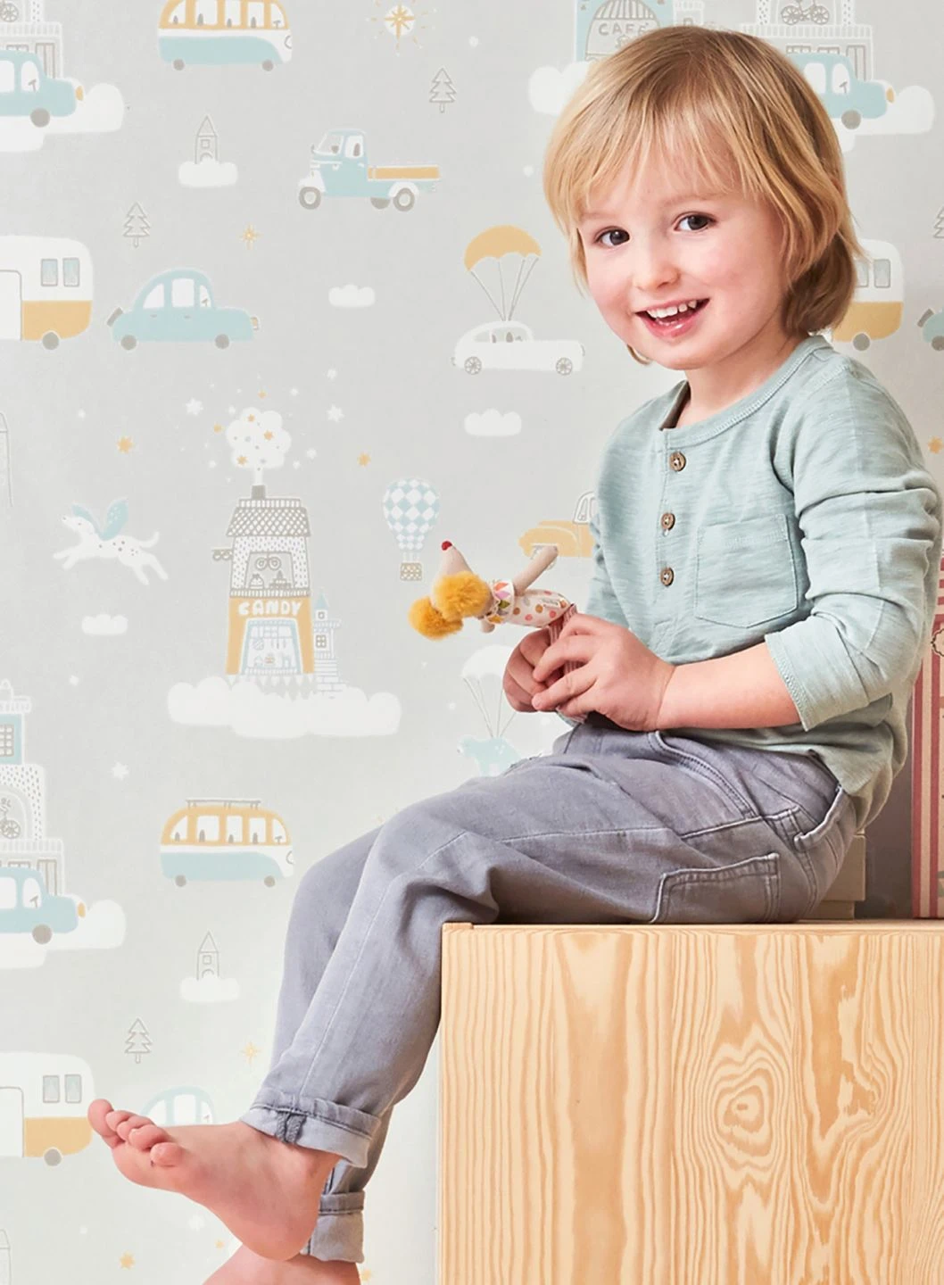 Kleine Auto-Fans werden an dieser Kinderzimmertapete aus dem Hause Majvillan ihre helle Freude haben: Autos, Motorroller und Wohnwagen fahren zwischen Häusern, Bäumen und Wolken durch eine freundliche Welt. Die Farben – Cremeweiß, Honiggelb und Minttürkis auf neutralem Weißgrau – sind perfekt aufeinander abgestimmt. Das verwendete Leimdruckverfahren macht die Tapete zu einem besonders hochwertigen Wandschmuck.