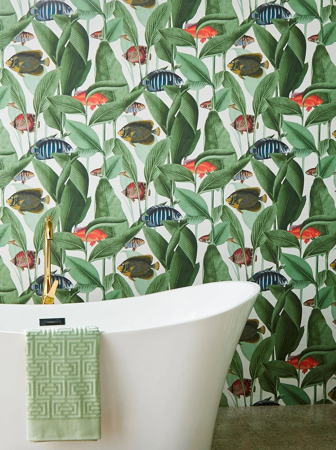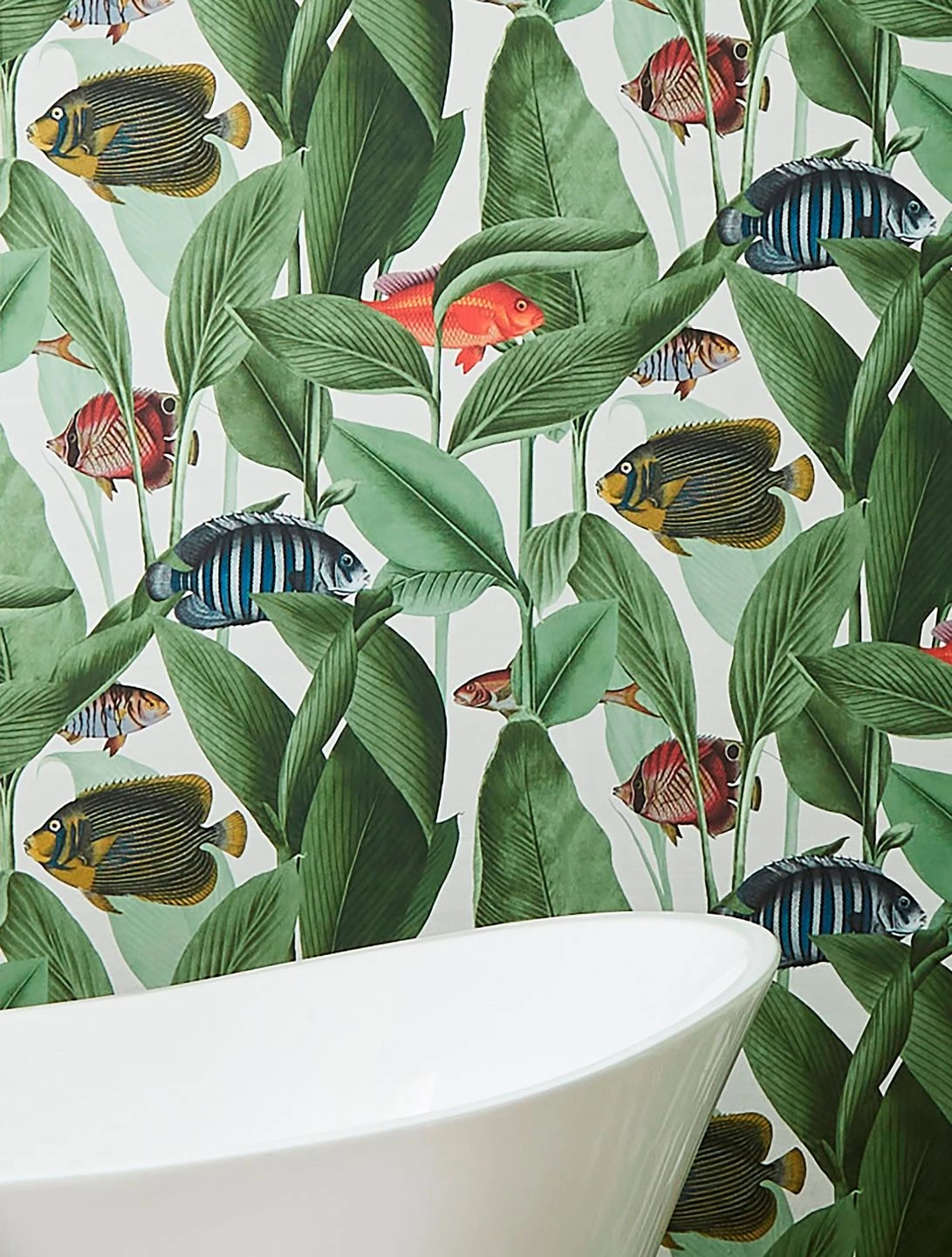 Naturgetreu gezeichnete Wasserpflanzen erzeugen ein Labyrinth aus Stängeln und Blättern, in dem die Illusion räumlicher Tiefe entsteht. Zwischen den Pflanzen tummeln sich farbenfrohe exotische Fische. Ihre leuchtenden Blau-, Goldgelb- und Rottöne auf dem weißen Untergrund der Vliestapete machen den Wandschmuck freundlich. Gleichzeitig strahlt er die Stille der Unterwasserwelt aus und ist nicht nur für Aquarianer eine ästhetische Bereicherung.