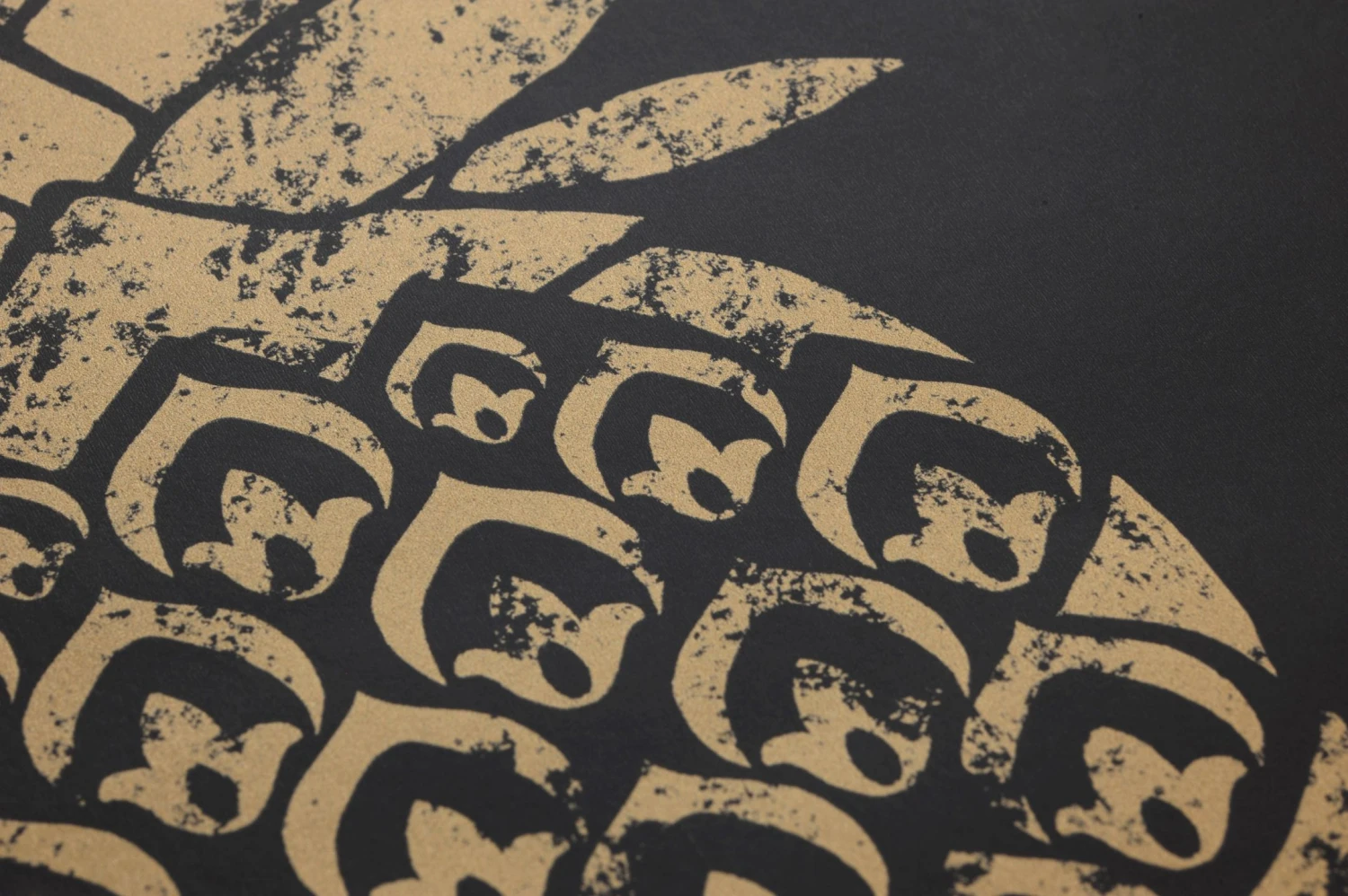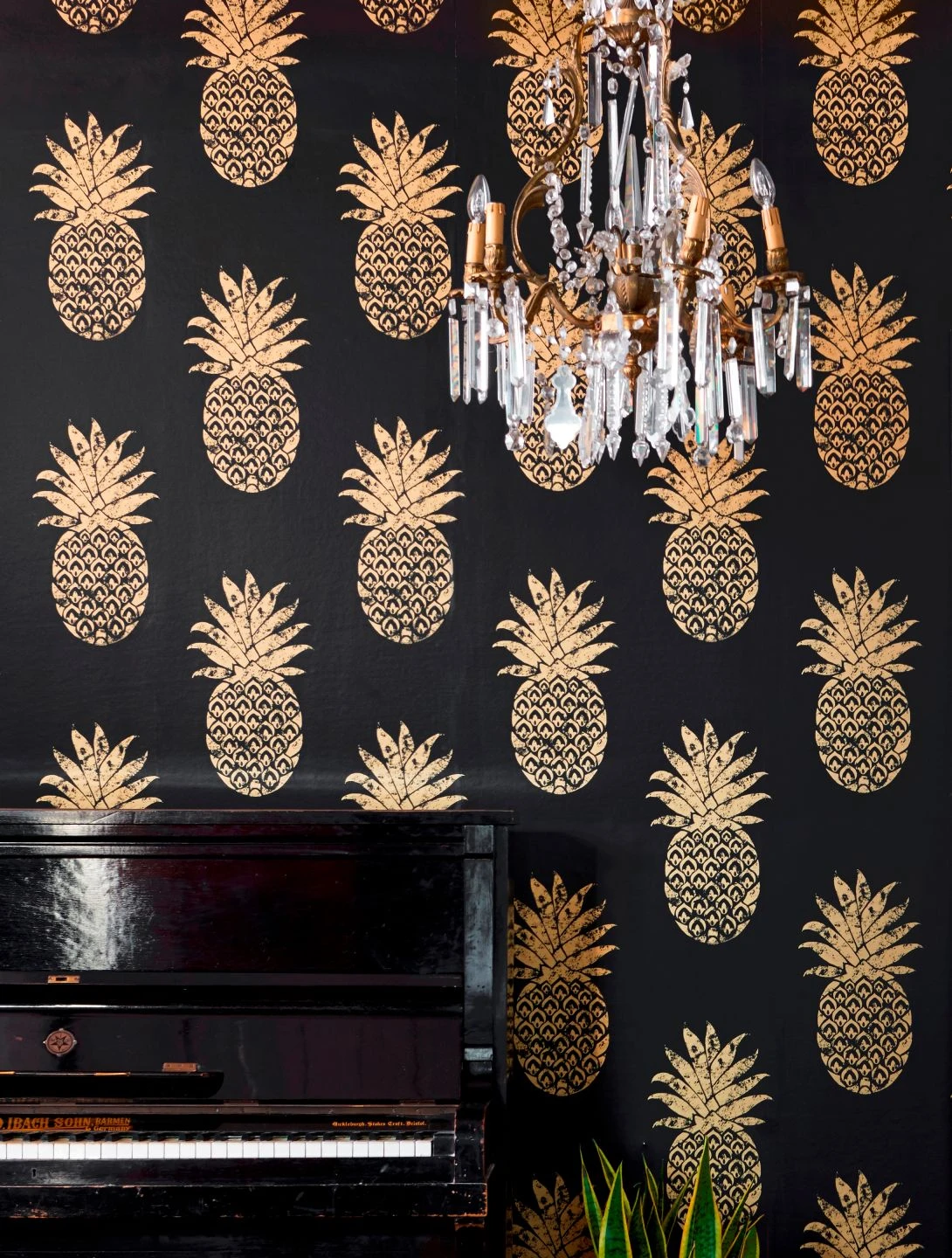 Schwarze Tapeten sind alles, aber nicht alltäglich! Vliestapete Ananas erinnert mit ihren stilisierten Ananasfrüchten, deren durchbrochene Farbflächen wie gestempelt wirken, an Motive aus der Ethno-Mode. Das schimmernde Gold des Musters auf dem schwarzen Grund umgibt Ihren Raum mit einer Aura des Geheimnisvollen und wirkt gleichzeitig kostbar. Die faszinierenden Lichtreflexe bilden einen interessanten Kontrast zum dunklen Hintergrund.