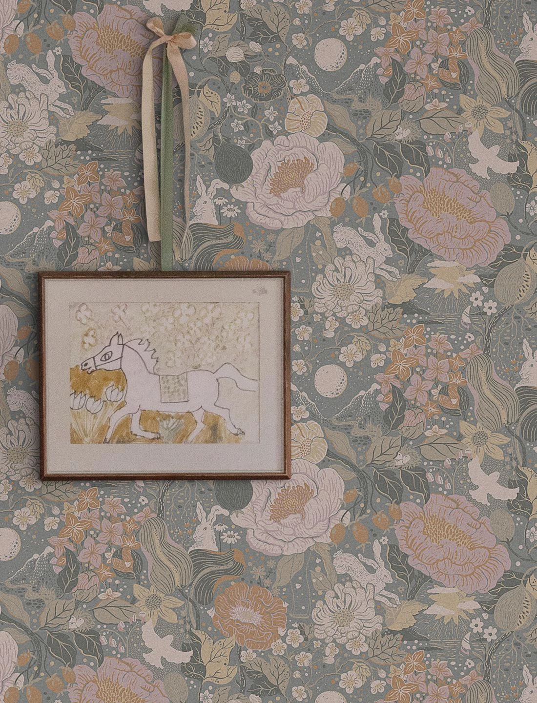 Das ist viel mehr als eine Blumentapete: Zwischen den ausladenden, geschwungenen Blüten kommen ganze Landschaften, Sonne und Mond, Tauben, Kaninchen und Früchte zum Vorschein. Geschickt lässt das Design Vordergrund und Hintergrund verschmelzen und Groß und Klein bedeutungslos werden. Die zeitlos schicken hellen Farben auf grauem Grund steuern zum phantasievollen Muster ein gekonntes Understatement bei.