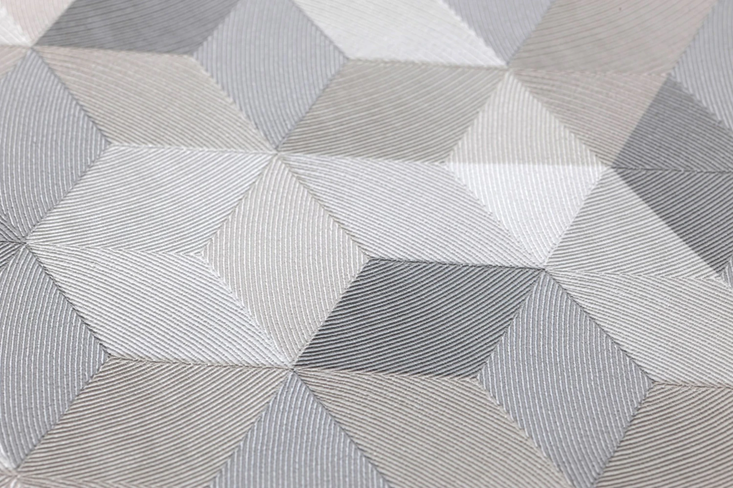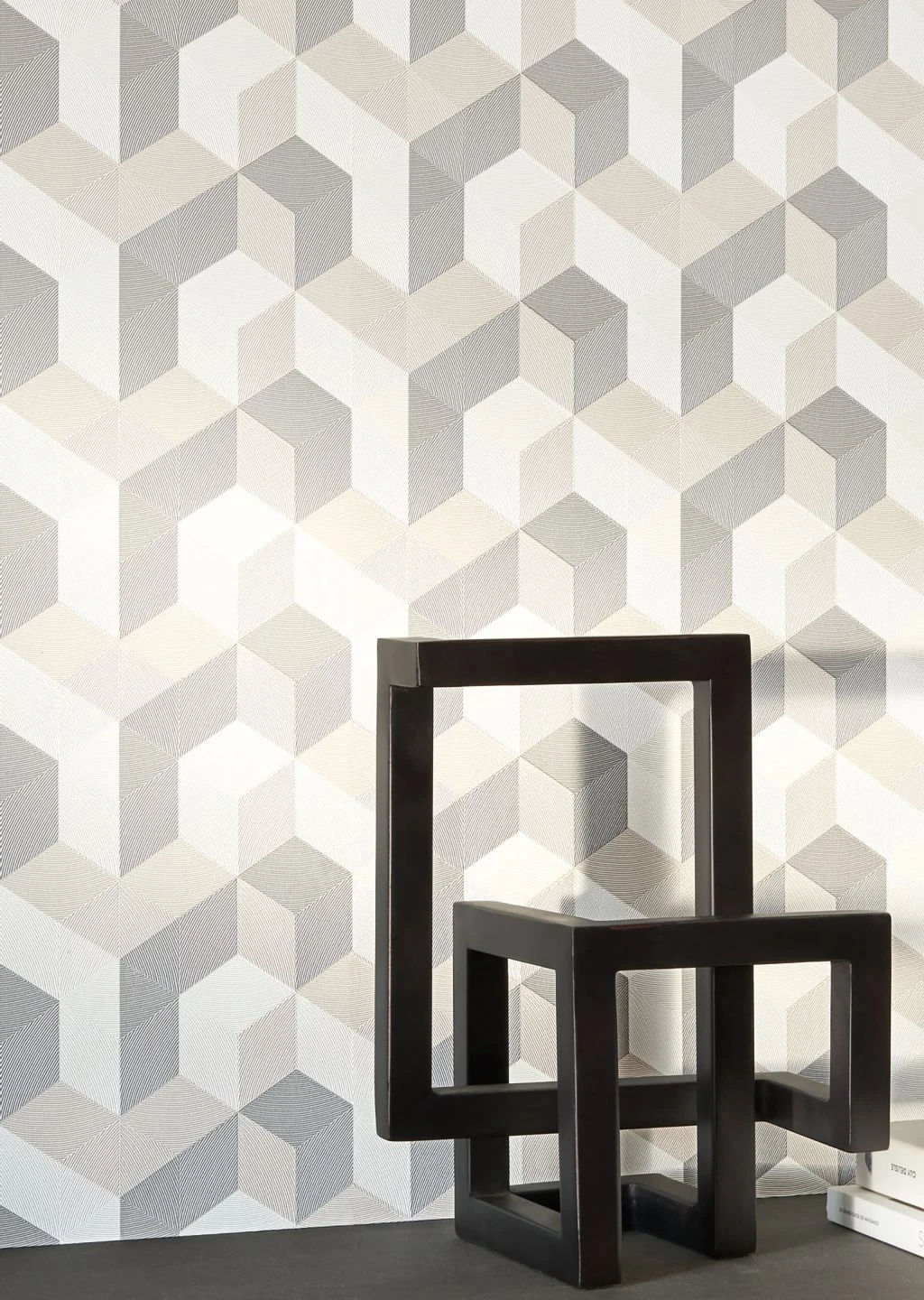 Schattierungen von Grau und Cremeweiß sind auf dieser geometrischen Tapete so geschickt angeordnet, dass Ihre Wand sich in ein dreidimensionales Labyrinth von Würfeln, Stufen und Kanten ähnlich einer Graphik von M. C. Escher zu verwandeln scheint. Der faszinierende 3-D-Effekt wird unterstützt durch die Schraffur der grauen Flächen, die als feine, fühlbare Struktur in das Vinyl der Oberfläche eingeprägt ist.