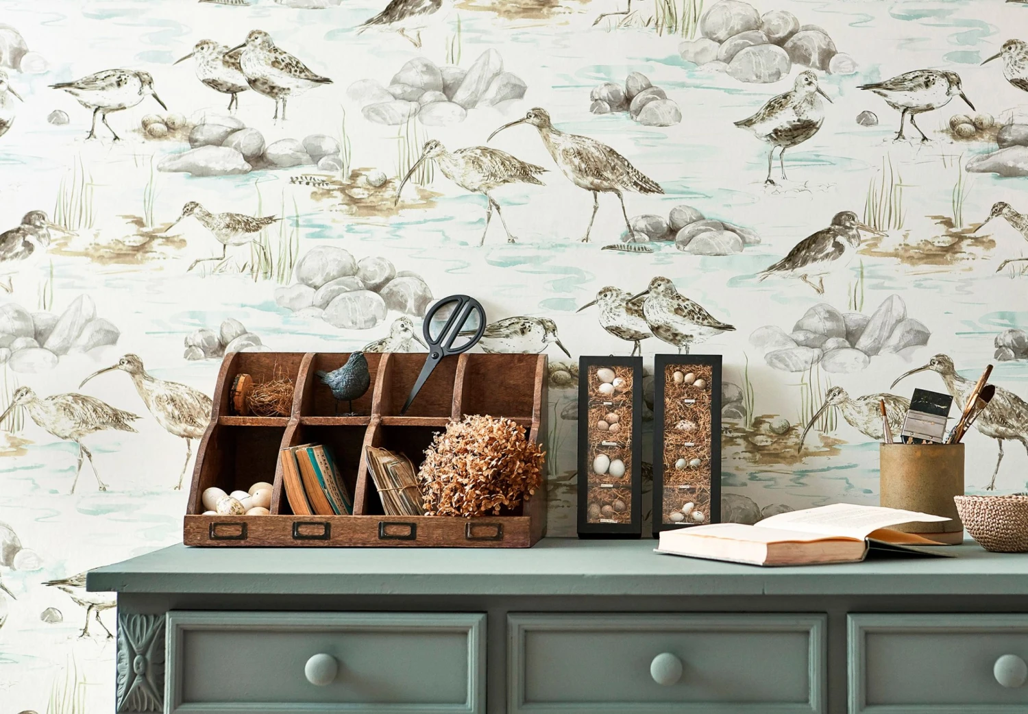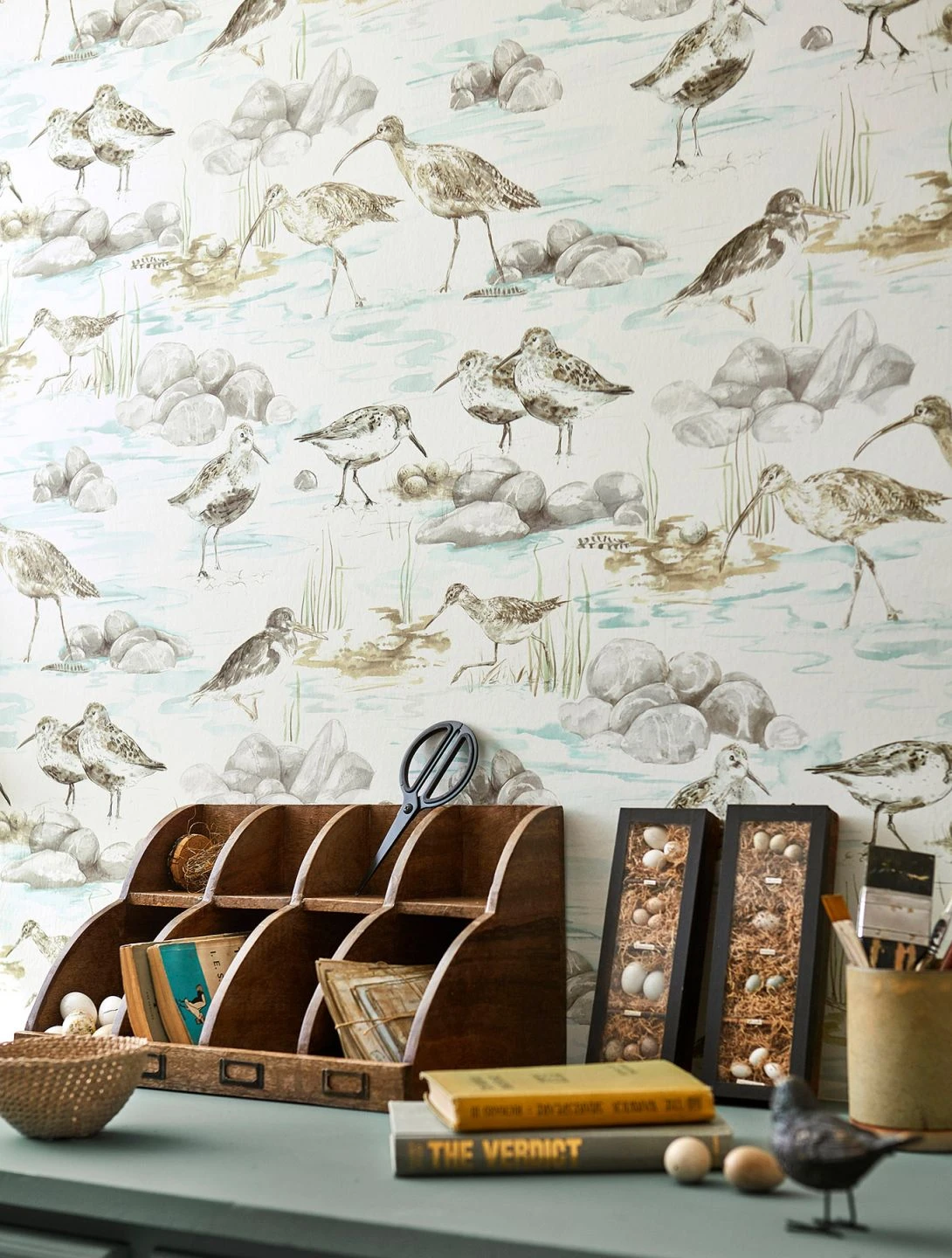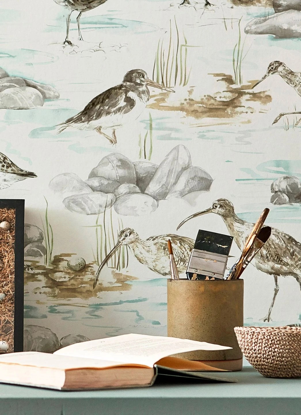 Mit sanften Farbtönen und zarten Pinselstrichen sind die Vögel auf dieser Tapete gemalt, so dass sie besonders lebensnah wirken. Fast meint man, ihr weiches Gefieder zu spüren. Austernfischer, Regenpfeifer und andere Arten sind zu sehen – ihnen allen ist gemeinsam, dass sie an der Küste leben, angedeutet durch kleine Flächen von Sand, Steinen und Gras. Die Tapete strahlt Ruhe und Unberührtheit aus und trägt zu Ihrem inneren Gleichgewicht bei.