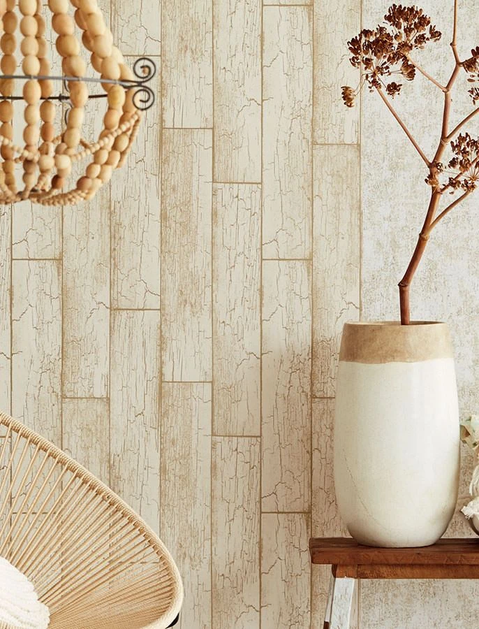 Cremweiss und Perlgold bilden die perfekte farbliche Ausgangsbasis für erhellende Raumkonzepte im natürlichen Holzlook. Und weil´s so schön ist, dürfen die alten Holzbretter auch abblätternde Farbschichten aufweisen, denn sie haben viel erlebt und können Geschichten erzählen. Holztapete Atoras ist ein Must Have für den vielgeliebten Shabby Chic, kommt aber auch in den naturnahen Einrichtungsstilen wunderbar zur Geltung.