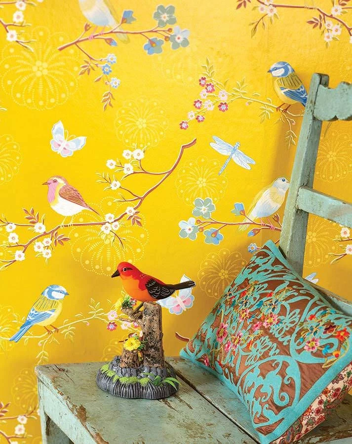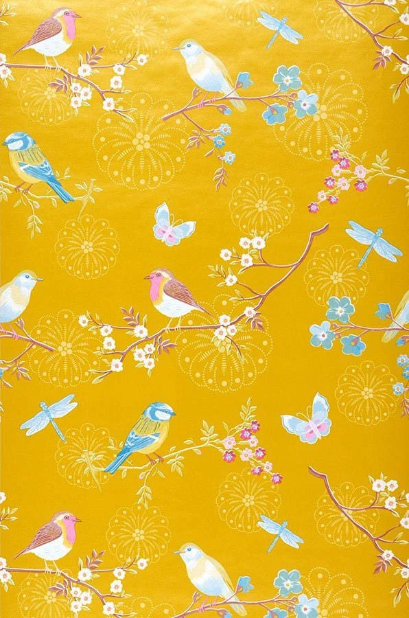Der Frühling ist da – in Goldgelb! In Ihrem Zuhause wird er mit unserer Audrey nie enden. Zarte Blüten, Vögel, Libellen und Schmetterlinge geben einen Vorgeschmack auf die erwachende Natur.