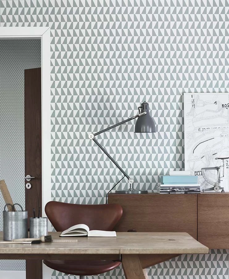 Schlicht und dennoch äußerst effektvoll ist das grafische Muster der Vliestapete „Balder“. Angeschnittene Dreiecke in Mintgrau und Weiß füllen die Ebene Ihrer Wand gleichmäßig aus. Allein durch die abwechselnde Ausrichtung der Elemente in den einzelnen Reihen entsteht das Gefühl einer Wellenbewegung. Die sachliche Atmosphäre eines Büros lockern Sie auf seriöse Weise auf. Aber auch eine Küche oder ein anderes Zimmer Ihrer Wahl sind mit der geometrischen Tapete immer schick gestylt.