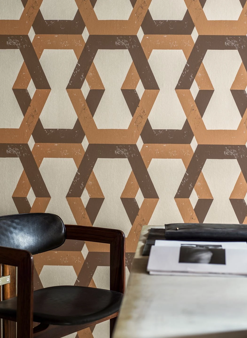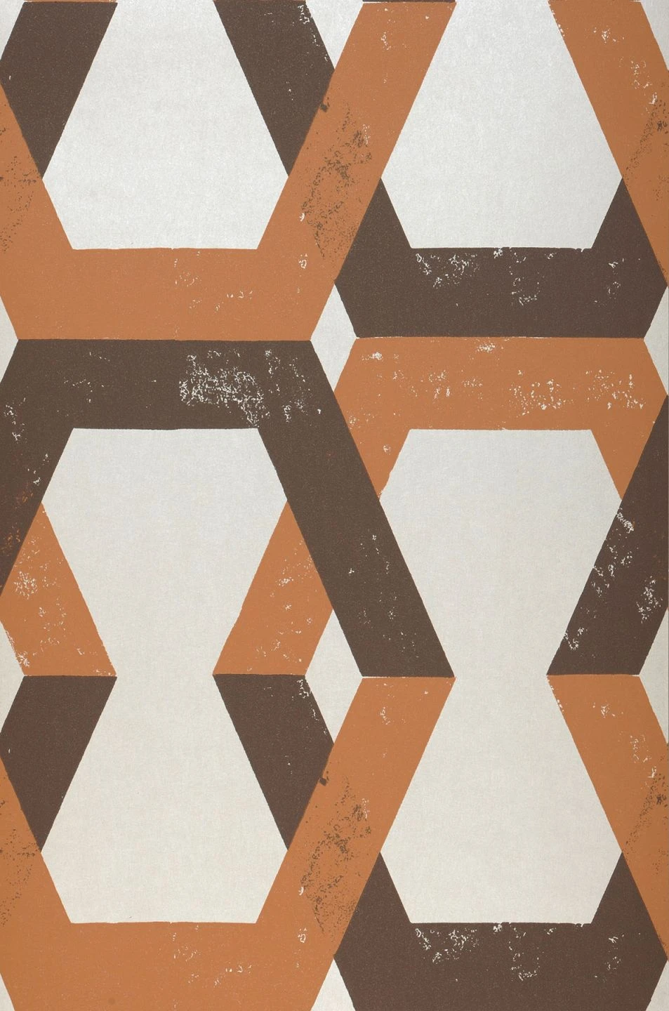 Wuchtige mehreckige Rahmen in Lehmbraun und Schokoladenbraun überlappen und geben dem cremeweißen Untergrund der Vliestapete Struktur. Auf den zweiten Blick ist zu erkennen, dass die Farben an vielen Stellen durchscheinend sind. Zum außergewöhnlichen Retro-Design passen ausdrucksstarke Vintage-Möbel aus den 70er Jahren, die der kraftvollen Tapete einen wirkungsvollen Kontrapunkt bieten – egal ob in Erdfarben oder hellen Creme- und Weißnuancen.