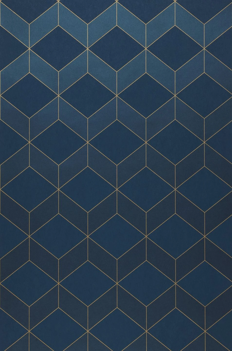 Durch das Zusammenspiel schimmernder und matter Blautöne, begrenzt durch schmale Linien in goldener Farbe, entstehen gleichmäßige Rauten und Trapeze. Diese spielen mit der Fläche der Wand und erzeugen einen dreidimensionalen Effekt räumlicher Tiefe. Die Art-Deco-Tapete strahlt durch ihre blaue Farbe Ruhe und Belebtheit gleichermaßen aus und kreiert einen außergewöhnlichen Raumeindruck. Mit goldfarbenen Deko-Elementen greifen Sie das Schimmern der goldenen Linien perfekt auf.