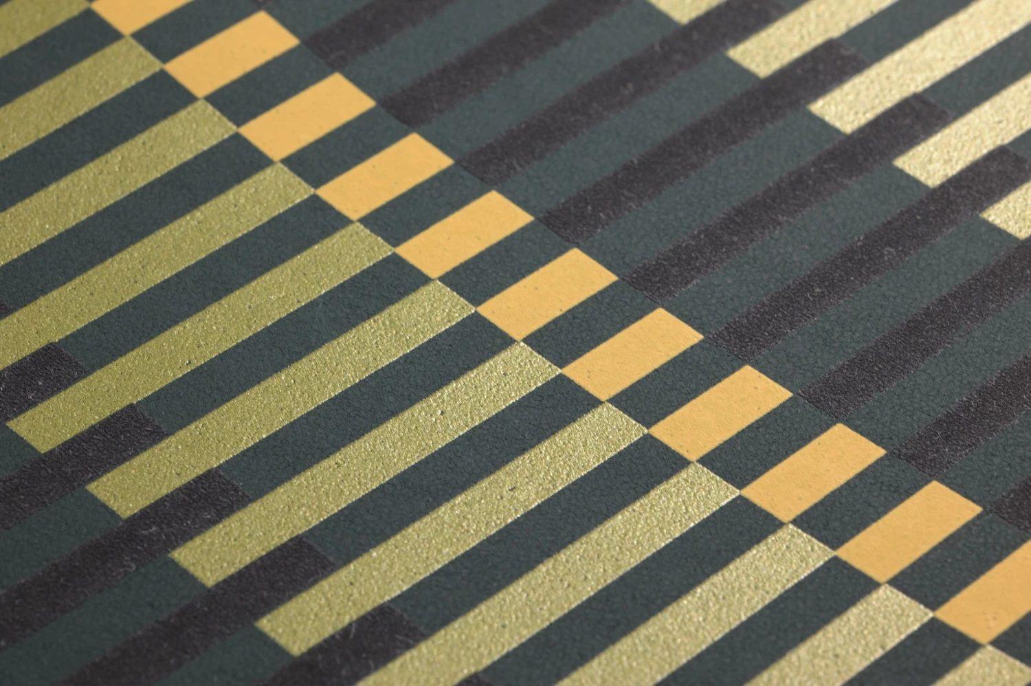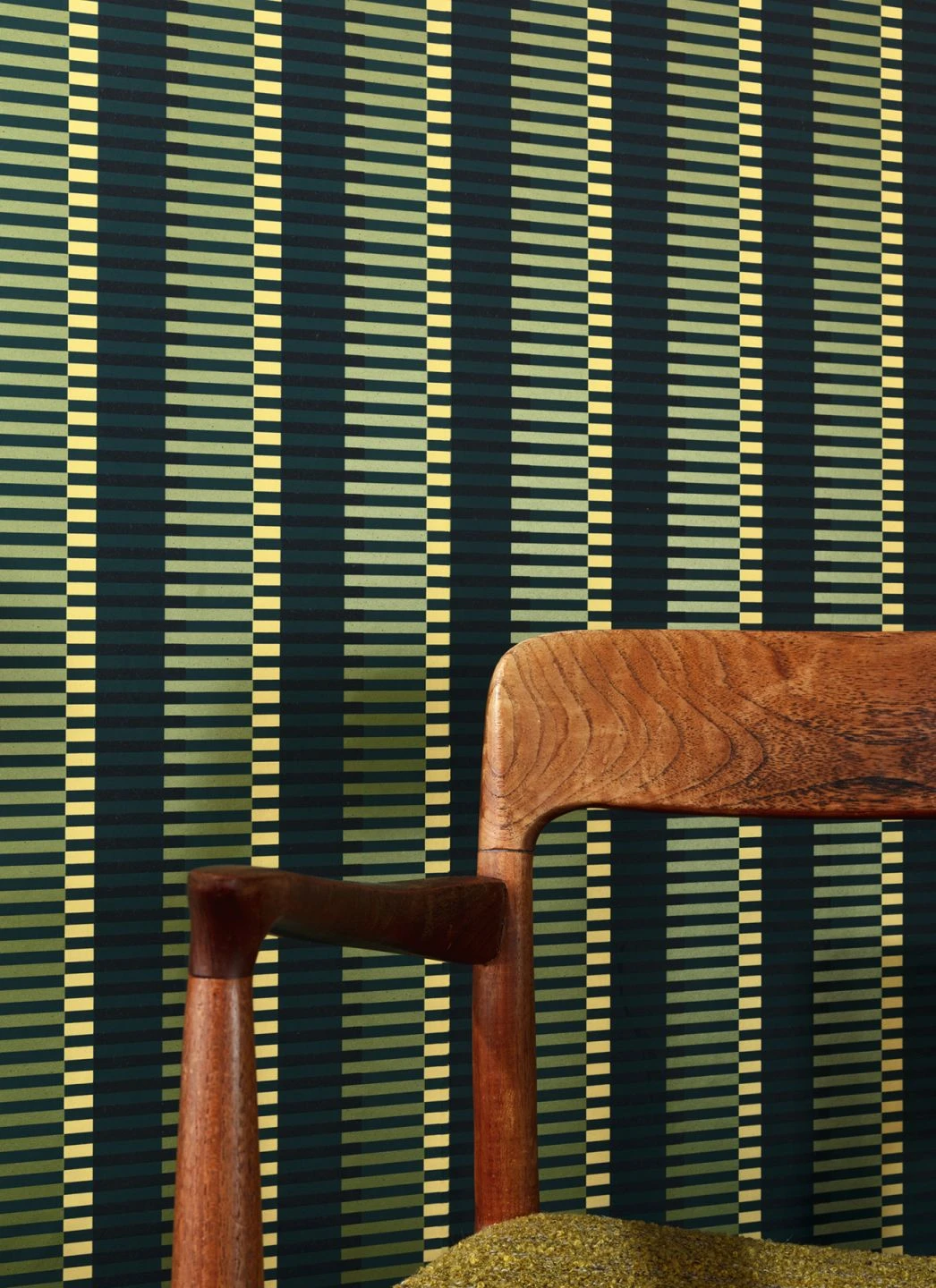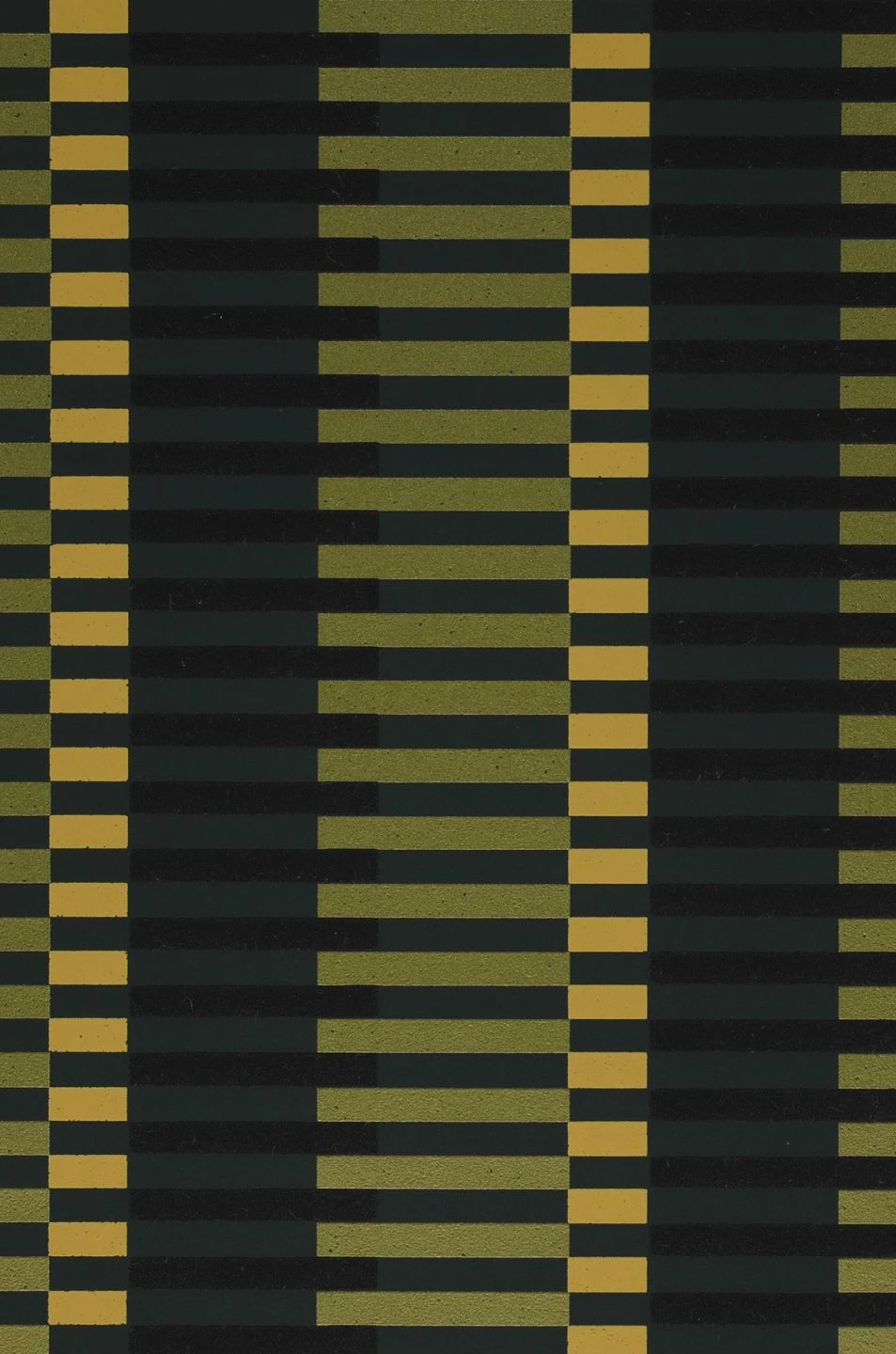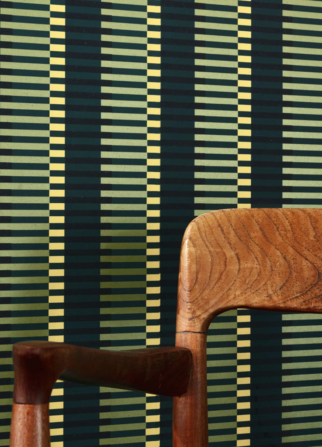 Schimmerndes Grün, weiches Gelb und Schwarz lassen die farbig versetzten Streifen in unterschiedlichen Breiten wie schlanke Streben im dreidimensionalen Raum wirken. Diese optische Täuschung modelliert z.B. kleine und schmale Räume, die dadurch deutlich großzügiger und tiefer erscheinen.