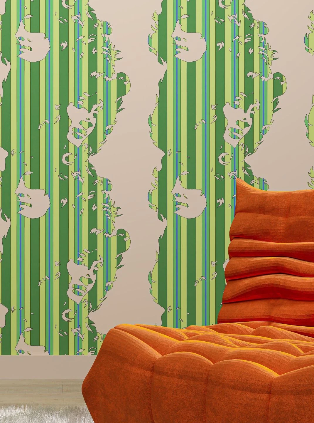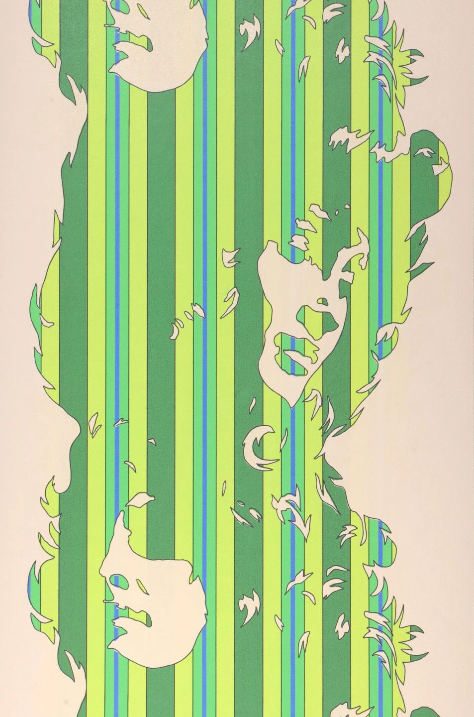 Werner Berges gibt dem traditionellen Streifenmuster eine ganz neue, spannungsvolle Dimension. Die schmalen Farbbänder im frischen, klaren Hell- und Dunkelgrün umrahmen die Silhouetten von Frauenköpfen mit zerzausten Haaren, die durch das Wechselspiel zwischen den lebhaften Kontrasten und dem leicht abgetönten cremefarbenen Hintergrund der Tapete entstehen.