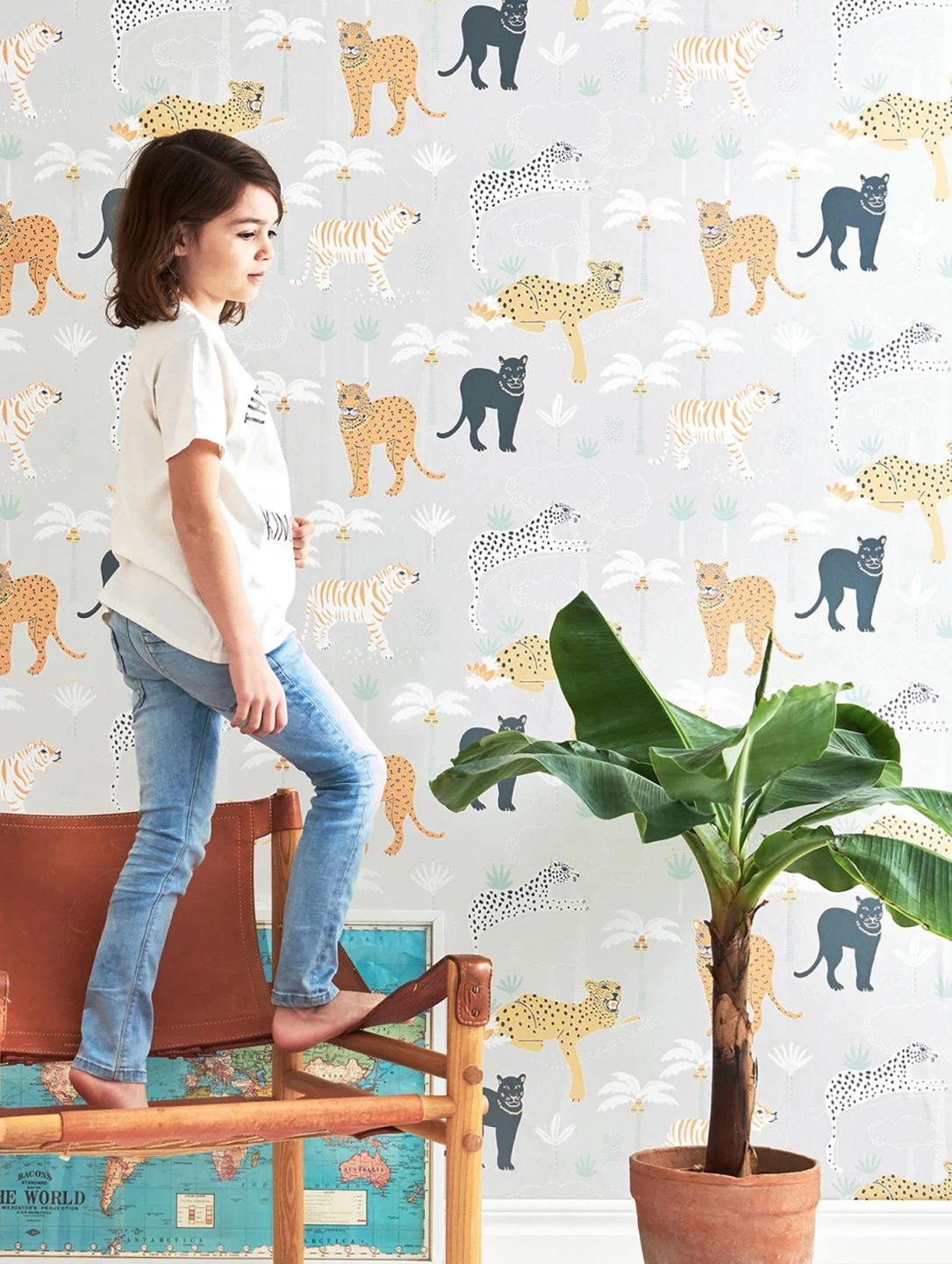 Welches Kind wäre nicht beeindruckt von der Kraft und Geschmeidigkeit großer Raubkatzen? Tiger, Panther, Geparden und Leoparden zwischen Palmen und Grasbüscheln schaffen auf dieser Kindertapete aus dem Hause Majvillan eine exotische Atmosphäre. Der neutrale weißgraue Grund tritt hinter den Fellfarben der kindgerecht gezeichneten Tiere zurück und lässt sich prima mit jeder Kinderzimmer-Einrichtung kombinieren.