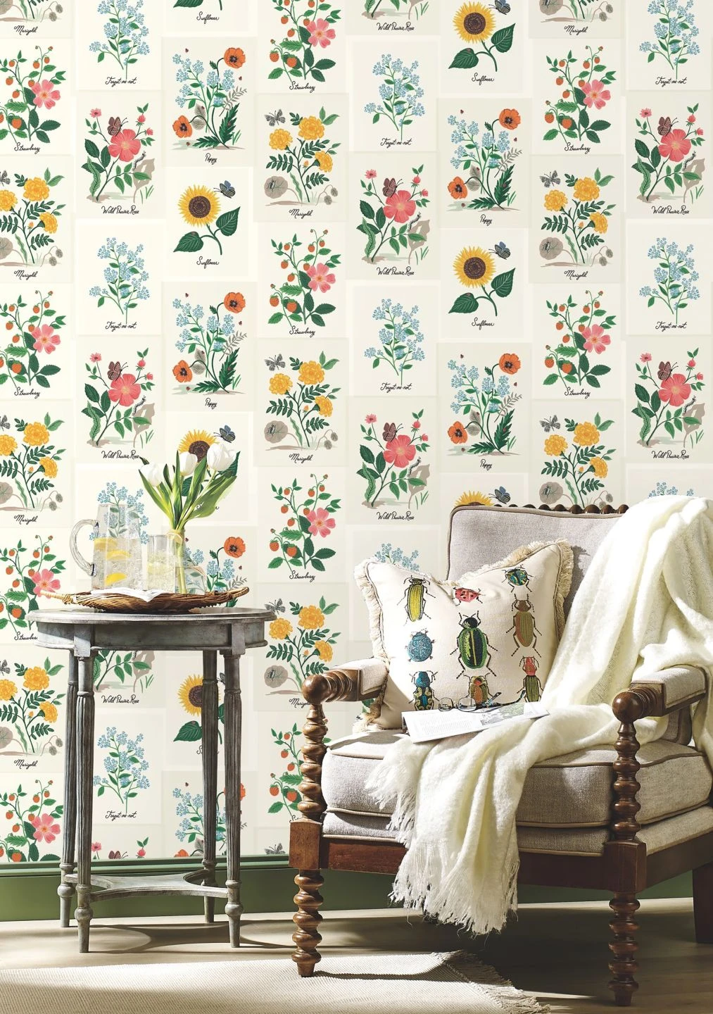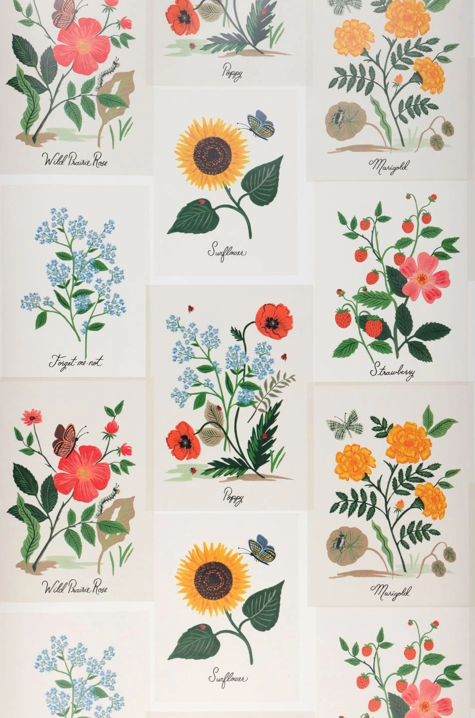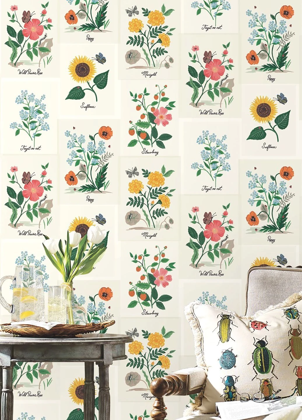 Wie die Illustrationen in einem kostbaren botanischen Nachschlagewerk sind die Blumen hier dargestellt. Bis ins kleinste Detail perfekt gezeichnet und in eleganter Schreibschrift beschriftet, bebildern sie Ihre vier Wände mit einem luftigen und außergewöhnlichen floralen Design. Zusätzliches Leben bringen Schmetterlinge und andere Insekten mit, die die farbenfrohen Abbildungen der Blumen ergänzen.
