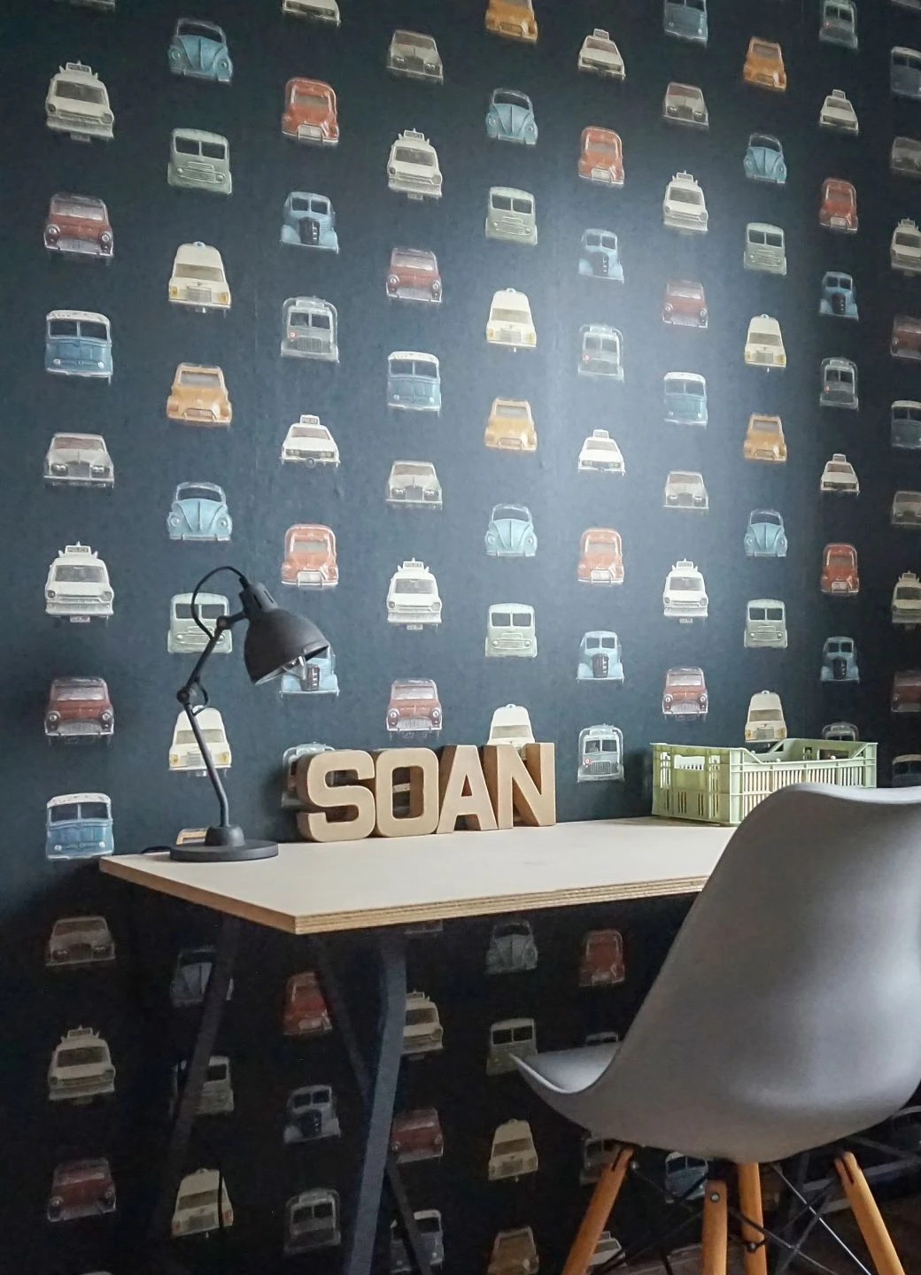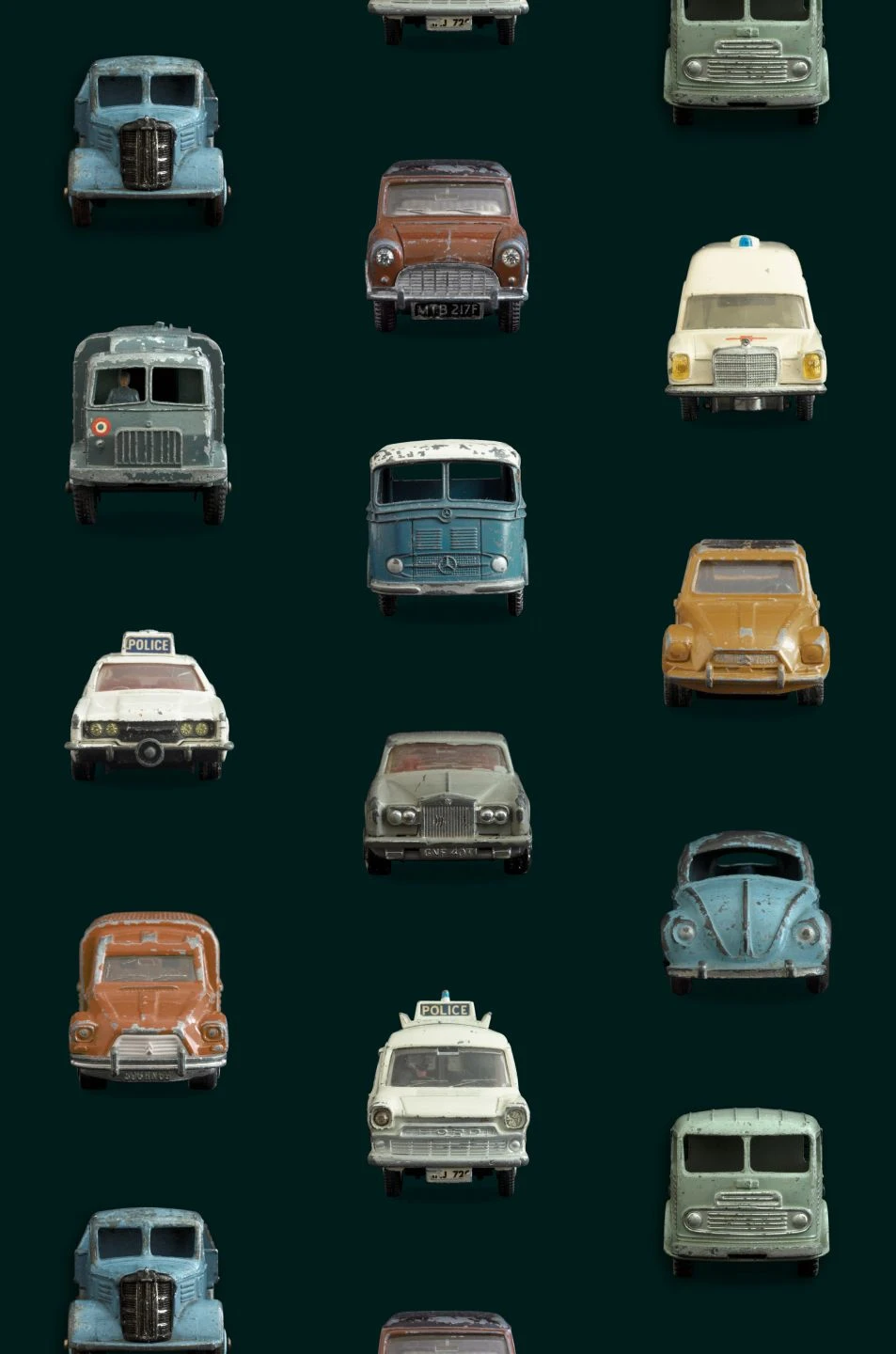 Kleine Auto-Fans werden begeistert sein: In ordentlichen Reihen wie auf einer mehrspurigen Straße fahren auf dieser coolen Kinderzimmertapete Spielzeugautos auf den Betrachter zu. Allesamt ältere Modelle mit deutlichen Spuren früherer Spiele, versprühen die Autos einen Hauch von Nostalgie. Auf dem schwarzen Untergrund kommen die Farben der Autos, Modetrends ihrer jeweiligen Epoche, besonders schön zur Geltung.