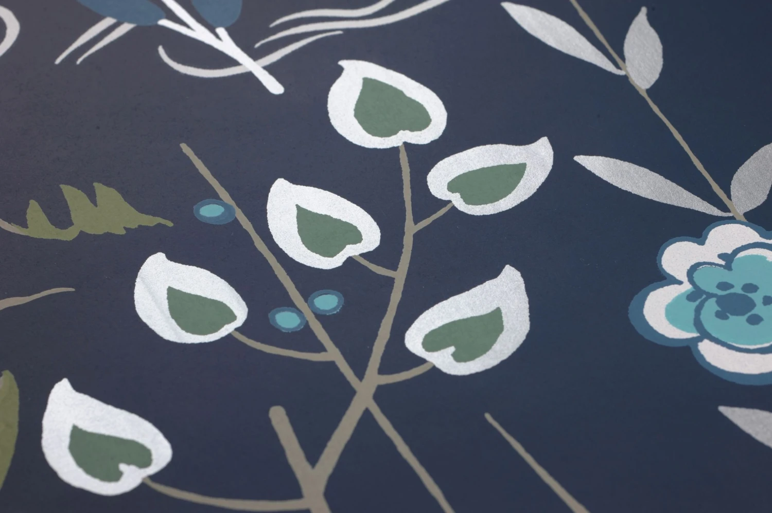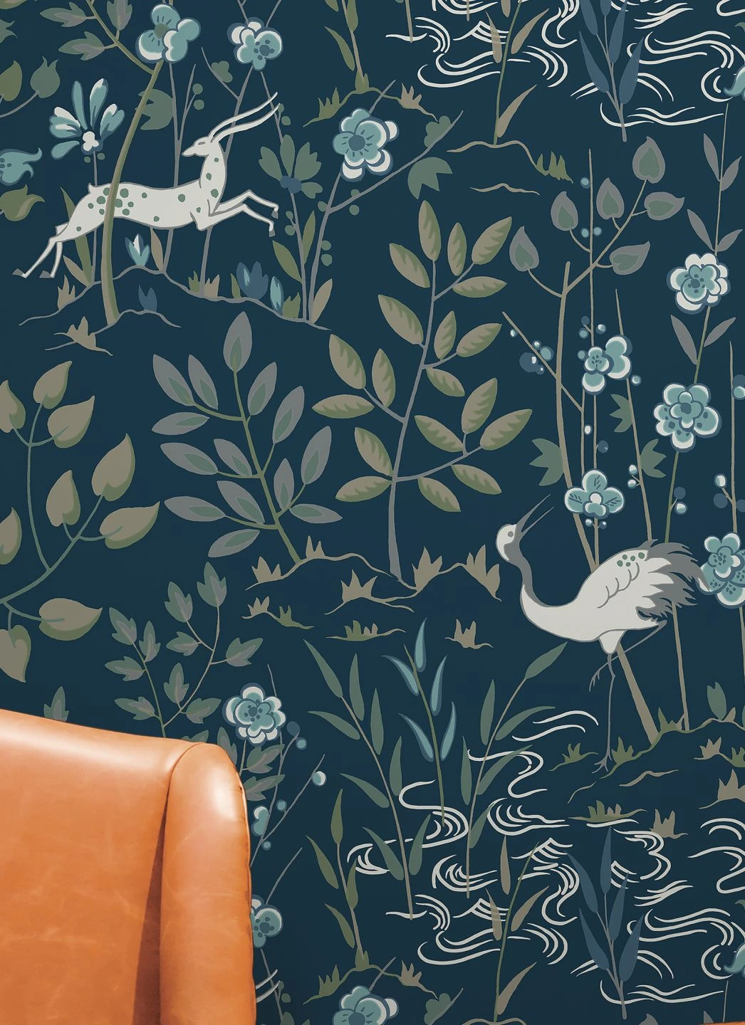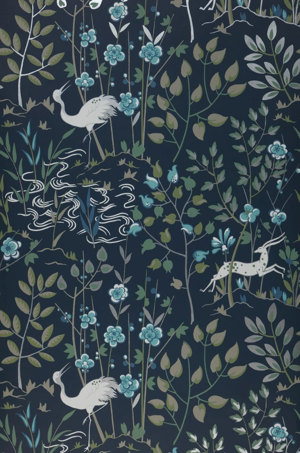 Mit Blumen, Blattpflanzen und angedeuteten Wellen kreiert Tapete Carumba eine Uferlandschaft, in der sich Antilopen und Kraniche aufhalten. Der asiatisch inspirierte Stil des Musters weckt die Assoziation ferner Länder. Zarte Blau-, Grau- und Grüntöne auf dem schwarzblauen Grund lassen eine geheimnisvolle abendliche Stimmung entstehen, in der das Brillantblau und das Perlhellgrau besonders zur Geltung kommen.