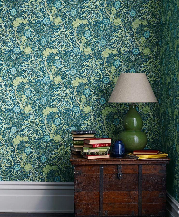 Die perfekte Kombination von Blau- und Grüntönen gibt dieser Tapete einen unverwechselbaren Charme. Ein gleichmäßiges Rankenspiel verschiedener Blätter, dazwischen blaue Blüten und rote Knospen, das ist einfach nostalgisch!