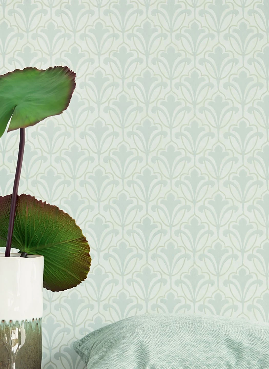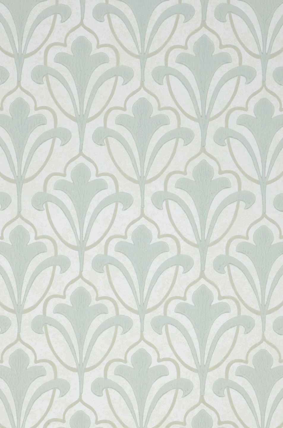 Das Jugendstilmuster, inspiriert von der formschönen Schwertlilie, formt sich je nach Perspektive immer wieder neu und anders. Diese optischen Effekte werden durch die intelligente Farbstellung in Blassgrünbeige, Olivgrau und Hellgrüngrau hervorgerufen. Die moderne Klassik in Grün liebt natürliche Holzmöbel.