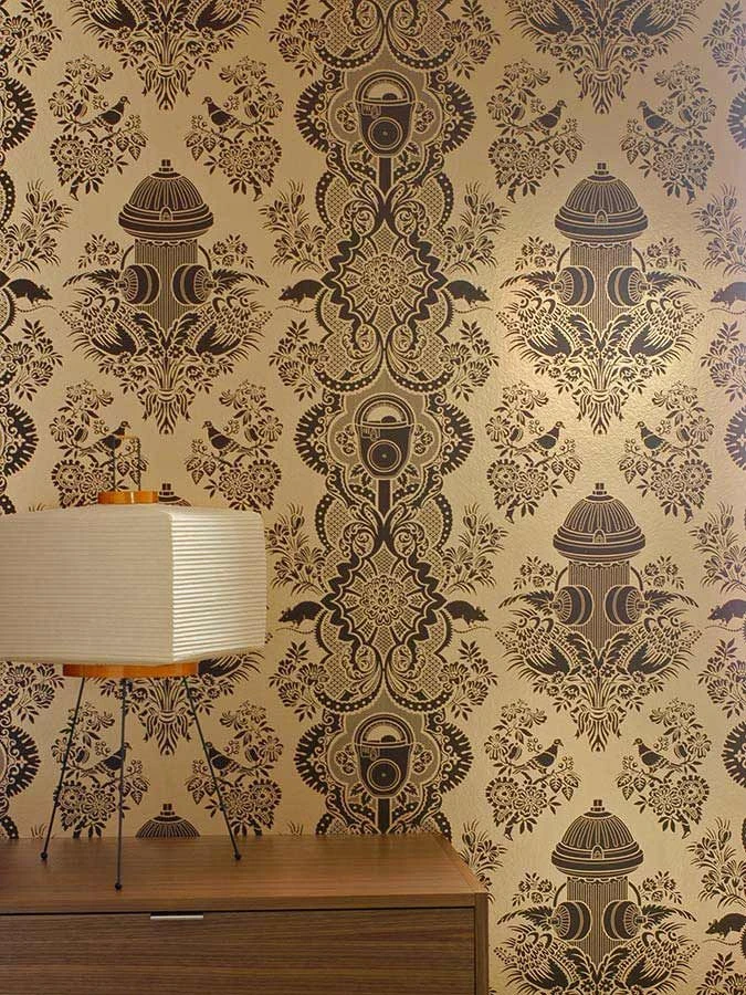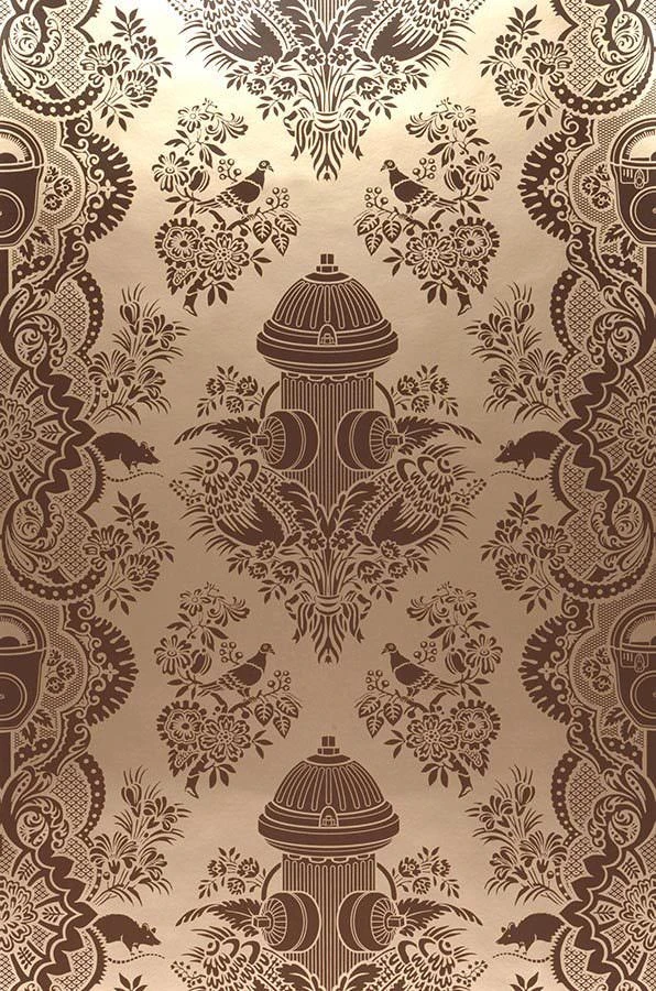 Geschickt spielt das Design von Flavor Paper mit der Konvention barocker Ornamente: Zwischen den klassischen Blüten und Ranken tauchen Parkuhren, Hydranten und weitere Überraschungen auf und verweisen auf New York, die Stadt von Broadway und Central Park. Die augenzwinkernde Synthese von Historie und Moderne macht das Design zeitlos. Die Farbkombination von Dunkelbraun und schimmerndem Cappuccino wirkt gleichzeitig cool und elegant. Die Vliestapete ist ab einer Mindestmenge von drei Rollen bestellbar.