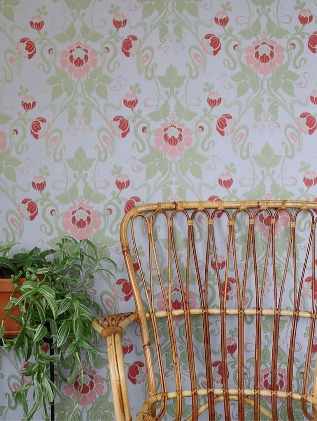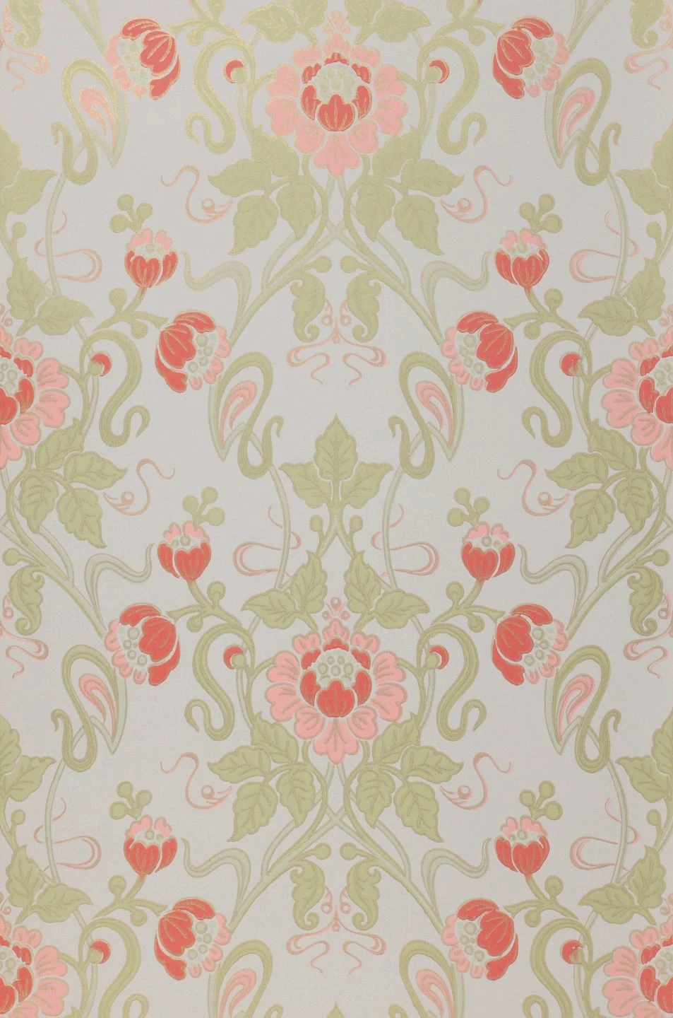 Besonders kunstvoll schlingen sich die lichtgrünen Blattranken auf dem hellen grauen Grund um die stilisierten und symmetrisch angeordneten Blüten in Rot und Altrosa. Akzente in schimmerndem Gold betonen die warmen Farbtöne auf dem grauen Untergrund. Diese luxuriöse Jugendstil-Papiertapete ist im traditionellen Leimdruckverfahren gefertigt und verströmt dadurch den unverkennbaren Charakter des Handgemachten.