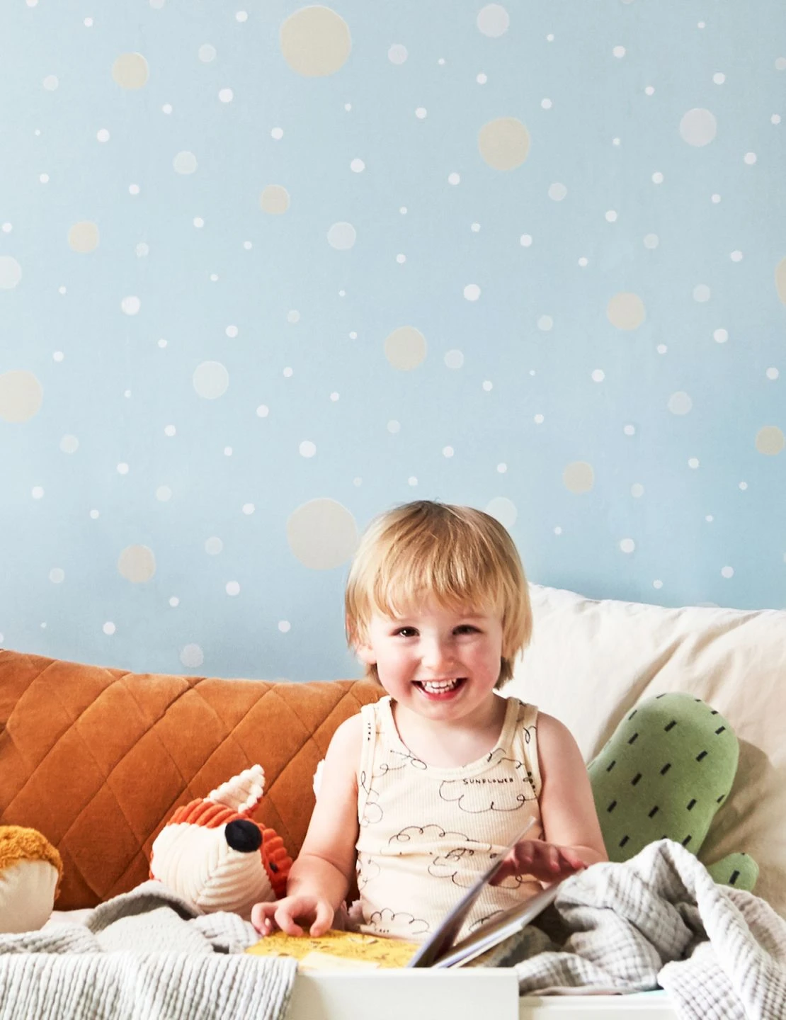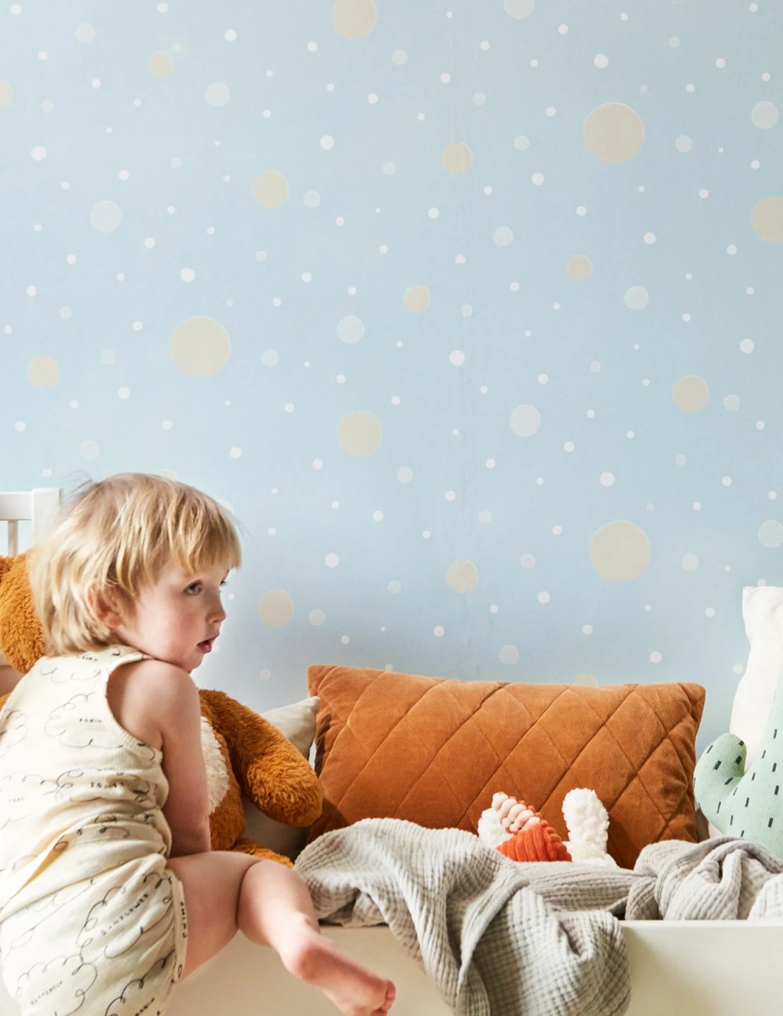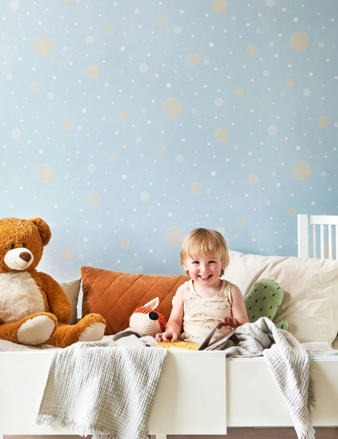Kinderwelten sind herrlich unkompliziert. Die Kleinen sehen in einfachen Formen viele Dinge. Und so wird aus den verschieden großen und runden Elementen nicht nur buntes Confetti. Die Farbkombination aus blassblauer Grundfarbe, Weißtönen und Hellbeige lässt auf der Majvillan Designer Tapete auch bunte Schneeflocken oder fantasievolle Himmelskörper erkennen.