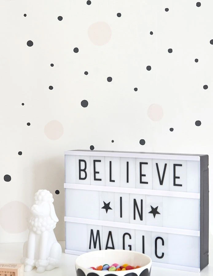 Extravagant zeigen sich die unterschiedlich großen Polka Dots in Anthrazitgrau und Blassbeige auf dem cremeweissen Tapetenuntergrund. Die Kindertapete von Majvillan hat eine sehr selbstbewusste Ader und ist genau die richtige Wandgestaltung für kleine und große Mädchen, die wissen, was sie wollen.