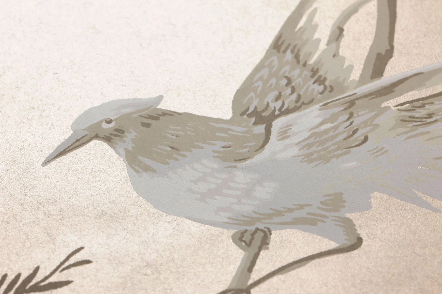 Seidig schimmerndes Perlbeige bildet den Hintergrund für Zweige voller Blüten und Blätter, auf denen Vögel mit prachtvollem Gefieder sitzen. Die eng miteinander und mit der Grundfarbe verwandten Grau-, Creme- und Brauntöne sowie Weiß sind im Leimdruckverfahren auf den schimmernden Grund aufgetragen und wirken dadurch besonders hochwertig. Die elegante Tapete im orientalischen Stil wertet Ihren Raum auf dezente Weise auf.