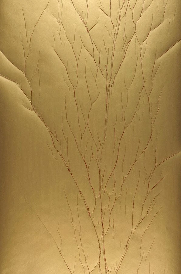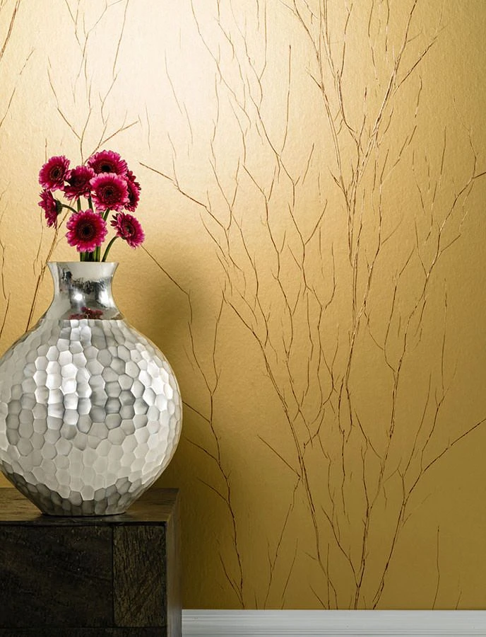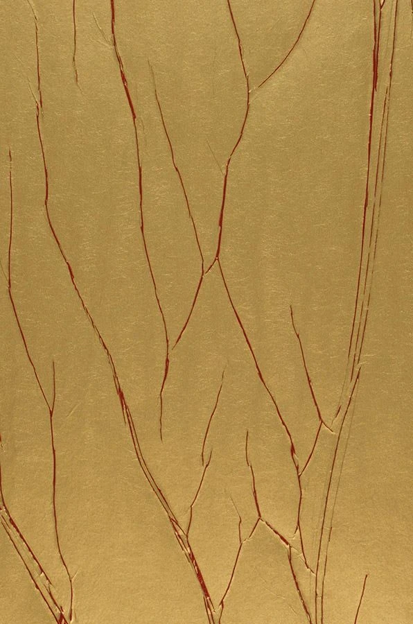 In Rot heben sich die feinen Falten von der goldenen Grundfarbe ab. Die Zweigstrukturen, in denen die Crush Tapete gearbeitet ist, formen stilisierte Baumlandschaften, die den Raum mit wahrhaft wachsender Kraft erfüllen. Kunst, Glamour, faszinierende Moderne vereinen sich in dieser erlesenen Design Tapete wunderbar.