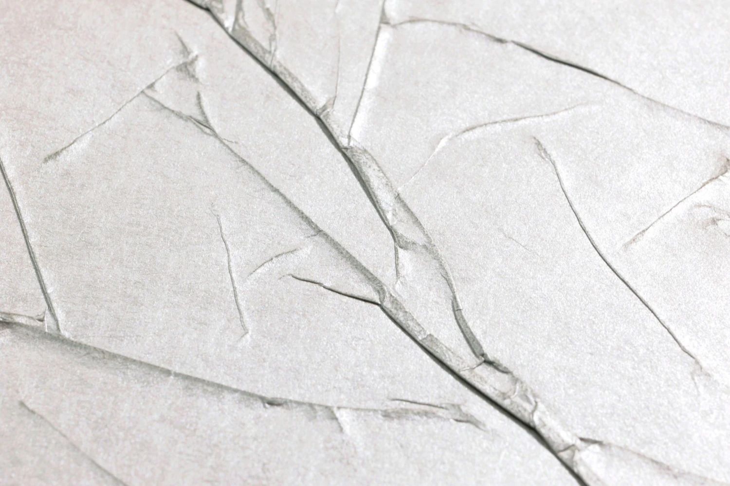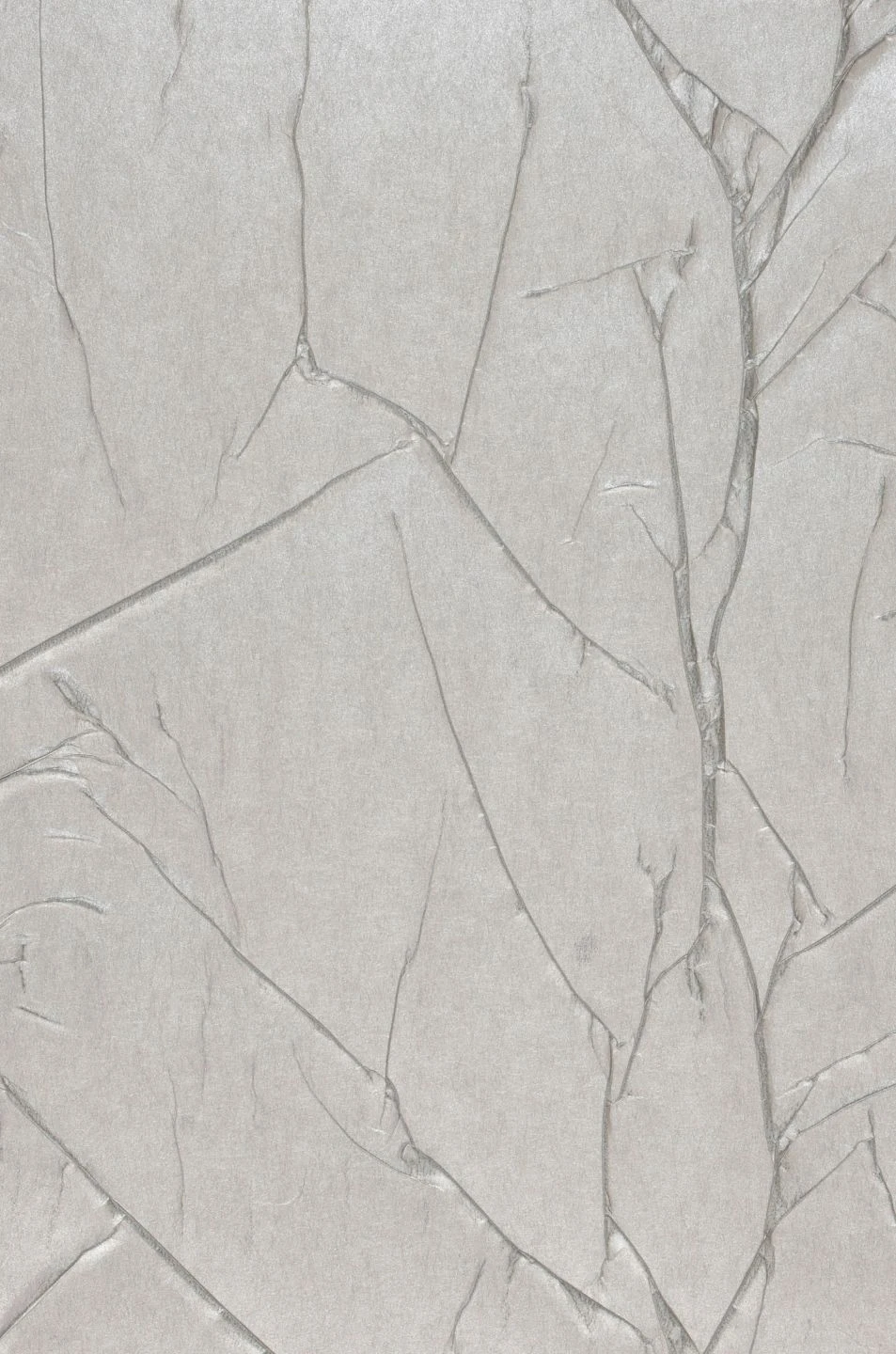 Inspiriert von den vielfältigen Formen der Natur, ahmen die Falten der Tapete Crush Wilderness 01 die fein verästelten Zweige eines Baumes nach. Mal etwas breiter und vollständig ausgearbeitet, mal nur zart angedeutet wie im Hintergrund, erzeugen die mit grauer Farbe nachgearbeiteten Falten im Oberflächenmaterial mit seinem hellen Farbton von Weißaluminium einen verblüffenden Eindruck von räumlicher Tiefe.