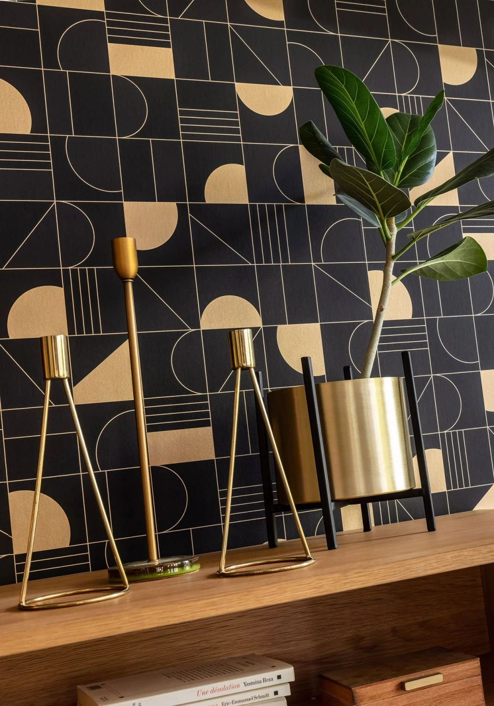 Diese luxuriöse Art-Deco-Tapete belebt Ihre Wände mit Kreisen und Dreiecken, feinen Linien und verschieden dimensionierten Rechtecken. Die Kombination von Perlgold und Schwarzgrau strahlt hochwertigen Schick aus und ist auf vielfältige Weise kombinierbar. Das unempfindliche Vinyl der Oberfläche sorgt dafür, dass „Cubit“ scheuerbeständig ist und selbst Ihrem Badezimmer den Look des Art Deco geben kann.