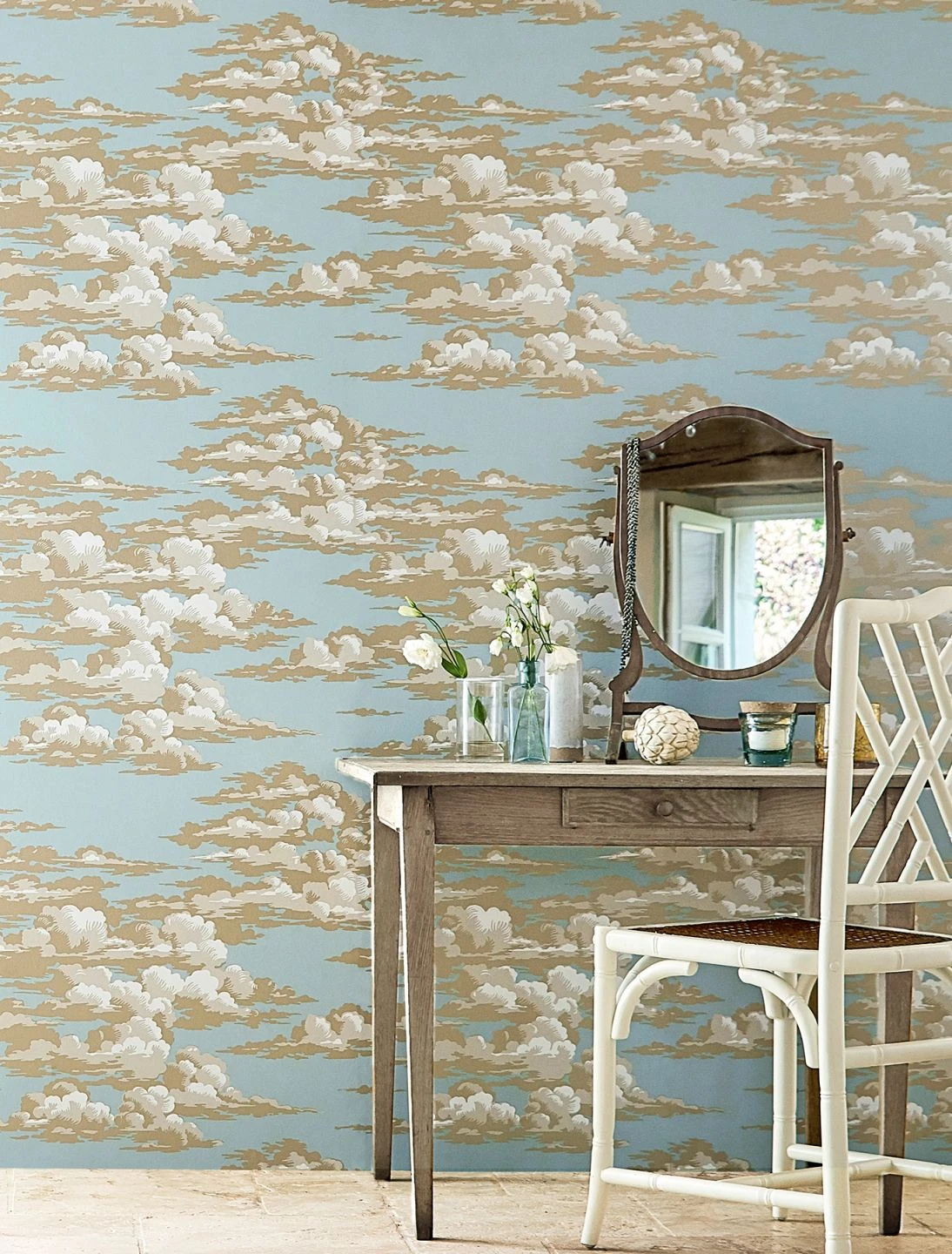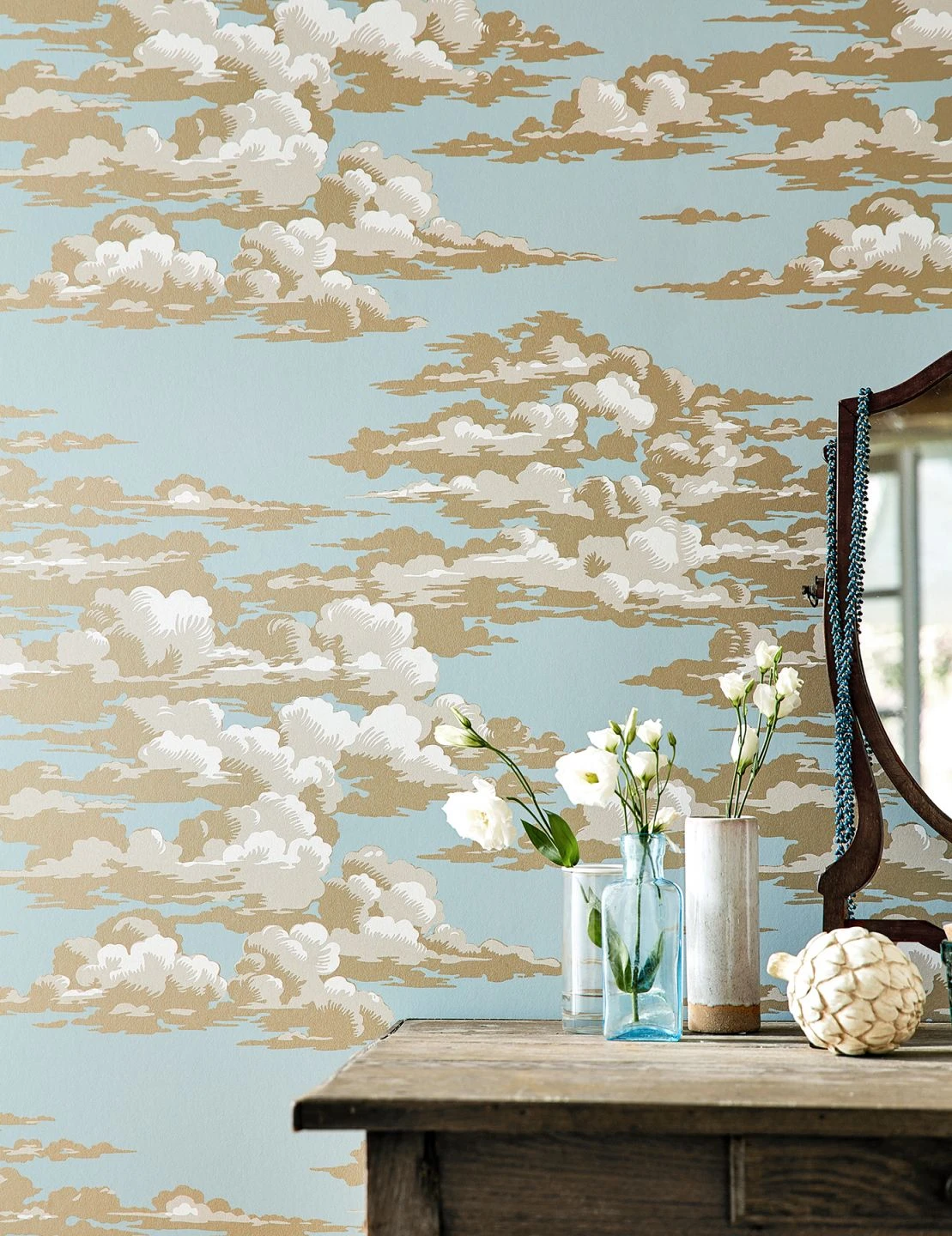 Stilisierte Wolken in Weiß, Hellbeigegrau und leicht schimmerndem Perlbeige ziehen über einen weißblauen Sommerhimmel. Sie verleihen Ihrem Raum zusätzliche Tiefe – so, als würden Sie Ihren Blick in die Ferne schweifen lassen. Der träumende Blick in die Wolken entspannt und lässt Sie zur Ruhe kommen. Die Tapete passt wunderbar zu weißen, cremefarbenen und Holzmöbeln und schmückt Ihr Schlafzimmer ebenso reizvoll wie Ihr Wohnzimmer.