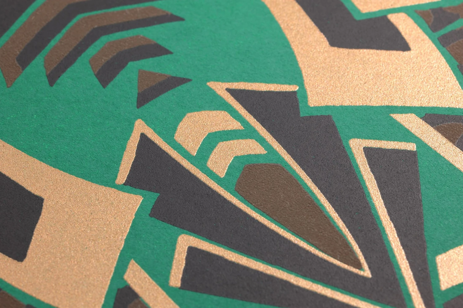 Die dekorative Kunst erstrahlt hier in Grün, Brauntönen und, wie es sich für den Art Deco Stil gehört, mächtigem Gold. Dadurch erhält das ausgefallene Grafikmuster, das von abstrahierten Blättern, Blüten und freier Geometrie lebt, seine gewaltige Aura. Es muss nicht immer Rot sein, wenn es um eine Signal-Sogwirkung geht, wie Designtapete Demetrius beweist.
