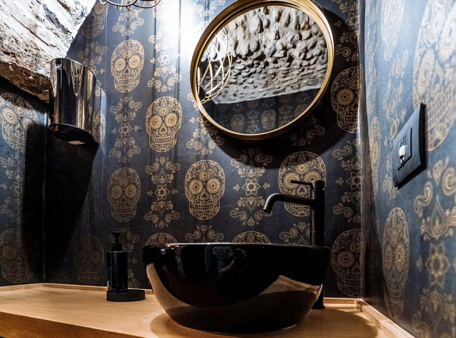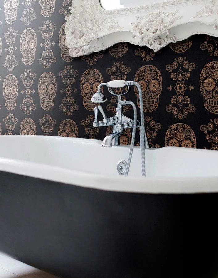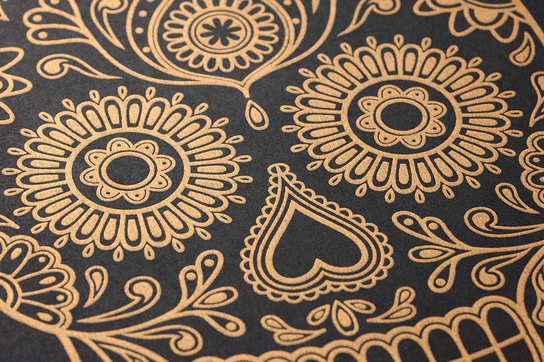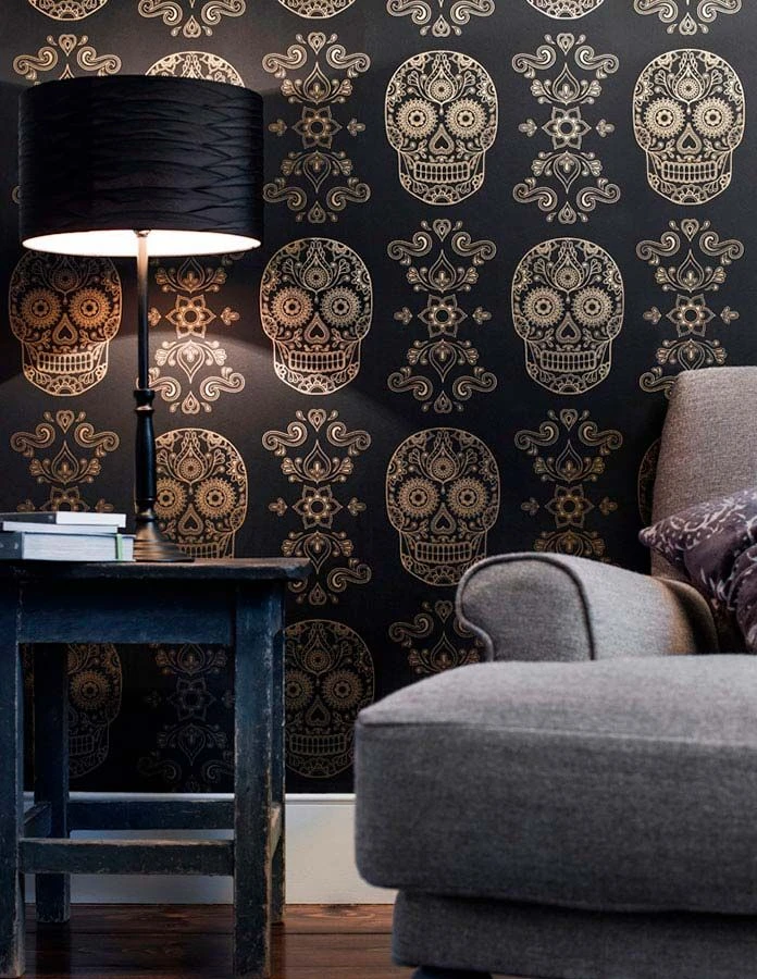 Wo immer diese Totenköpfe das Licht im Raum erblicken, erstrahlen sie in glamourösem Goldglanz. Raffiniert, bizarr und von spiritueller Eleganz zeigt sich die extravagante Muster Tapete, die mexikanisch inspirierte Skulls mit stilvollen floralen Elementen mixt. Mondänes Schwarz sorgt für emotionale Tiefe.
