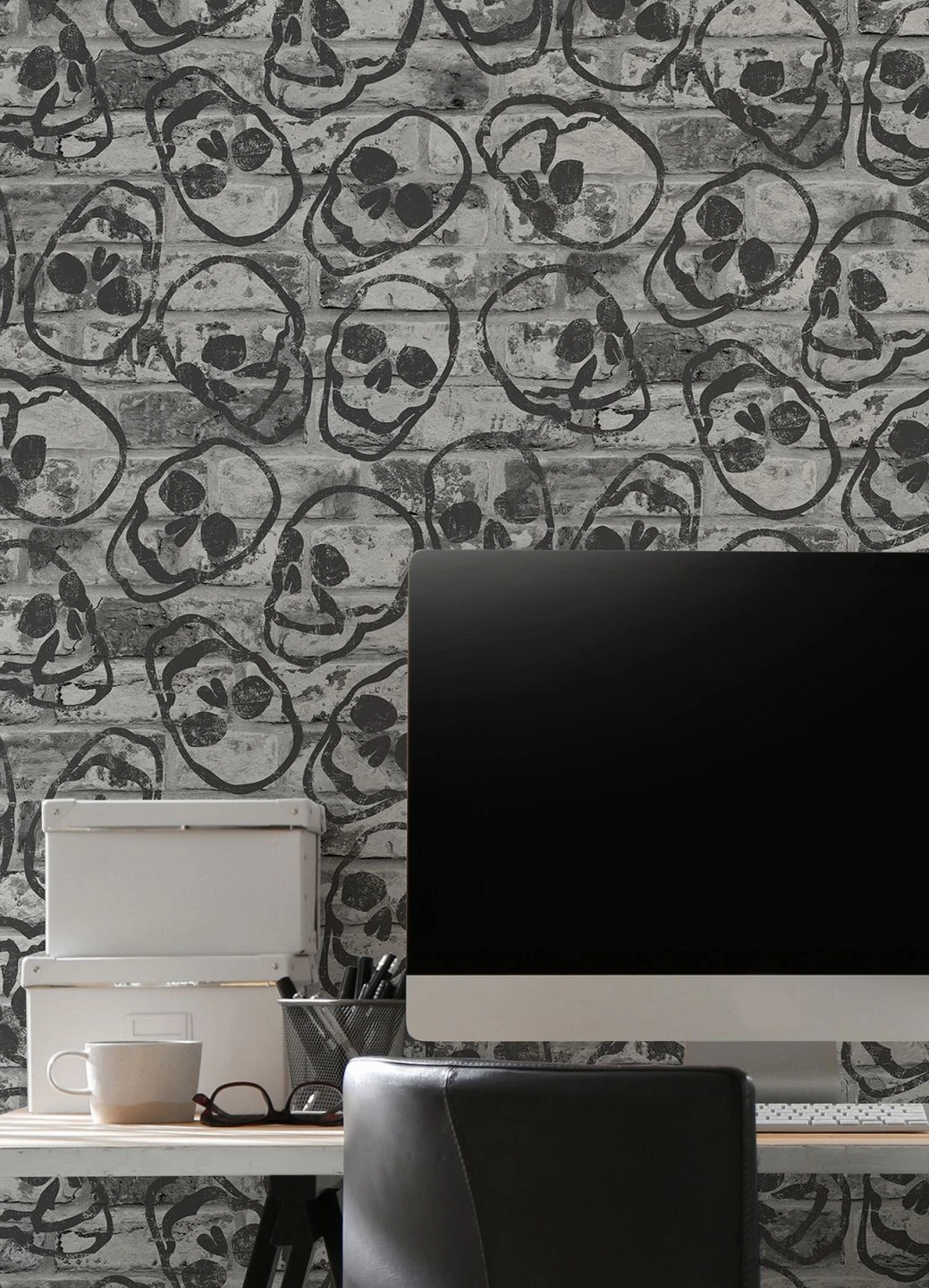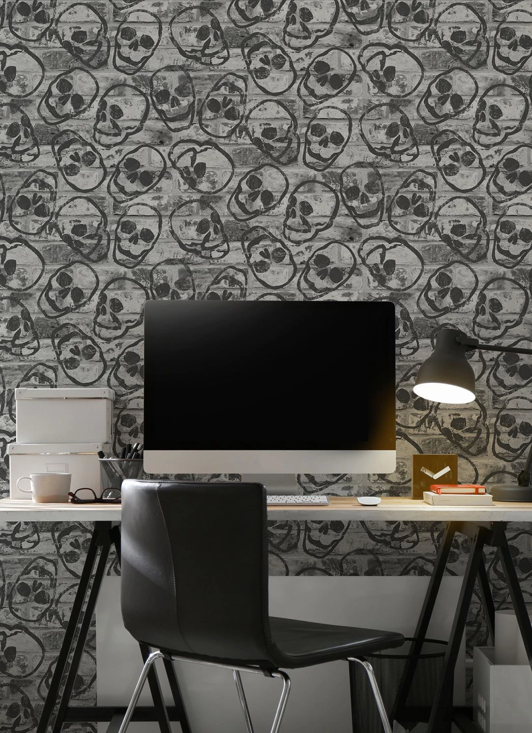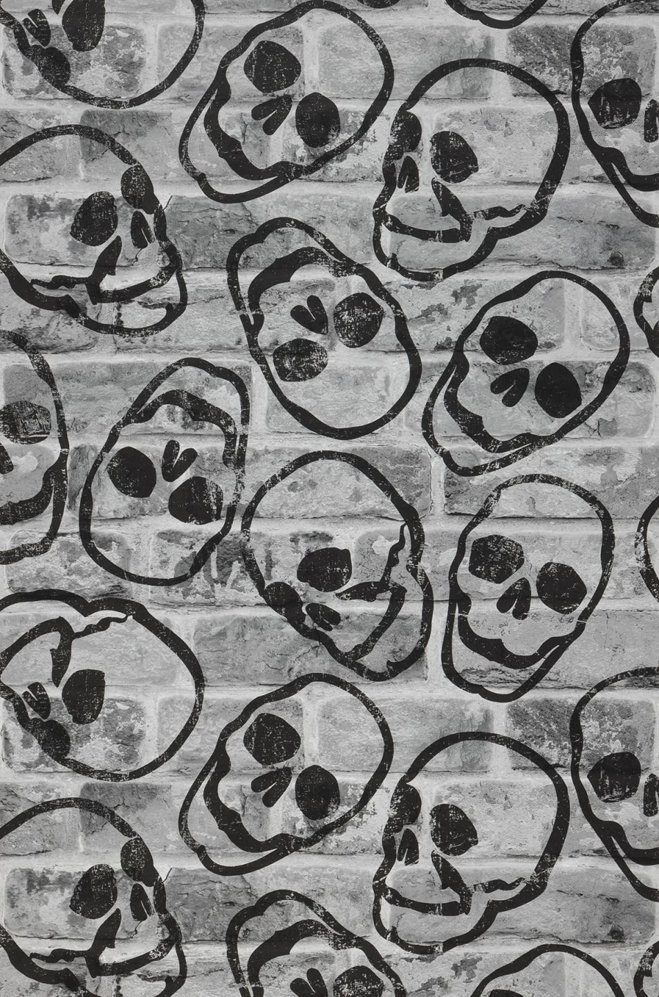 Gothic trifft Graffiti: Das rebellische Design der schwarzweißen Papiertapete vereint die Optik einer Backsteinmauer, die als Hintergrund fungiert, mit einem Muster aus Totenköpfen. Wie Graffitikunst wirken die Schädel auf der in Grautönen gehaltenen Mauer. Die Tapete spielt mit dem Symbol der Vergänglichkeit, des Rebellentums und der Gelehrtheit und stellt eine ausgefallene Bereicherung des Shabby Chic dar.