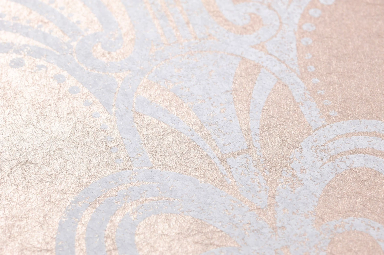 Pure Eleganz von geheimnisvoller Schönheit – Prickelnde Champagnerbrunnen bilden das suggestive Muster der Art Deco Tapete, die für entspannte Stunden geradezu prädestiniert ist. Der schimmernde Untergrund in Beigerot-Perlglanz setzt das Weiß des Musters je nach Lichteinfall neu und glänzend in Szene.