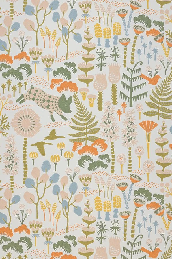 Ein Märchenwald aus stilisierten Blütenbäumen, in dem große und kleine Vögel ziehen und das Wildschwein lustig durch die Gegend hüpft – Romantiktapete Eurissa versetzt mit ihren lebhaften Farben auf weißem Grund Erwachsene und Kinder in betörende Stimmung. Der ausgefallene Eyecatcher kommt auch in Verkaufsräumen hervorragend zur Geltung.