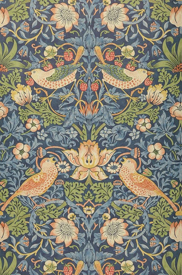 Eines der bekanntesten Designs des englischen Künstlers William Morris findet sich auf dieser farbenfrohen englischen Papiertapete: große und kleine Blüten in hellen Gelb- und Elfenbeintönen, verschlungen rankende Zweige mit filigran geformten Blättern, dazwischen Vögel und reife rote Erdbeeren. Auf dem graublauen Grund sorgt das immer wiederkehrende Taubenblau für Zusammenhalt. „Faunus“ liefert die perfekte Umrahmung für antike Möbel und den klassischen englischen Stil.