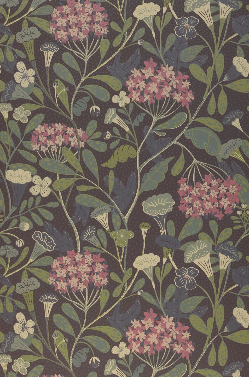 Blütendolden, Knospen und Kelche erblühen zwischen Blättern, die in einer Vielzahl von Formen und Farben dargestellt sind. Rosa und Elfenbein, Graublau und verschiedene Grüntöne geben der Vliestapete ein freundliches Gesicht. Die hellen, aber gedeckten Farben heben sich angenehm vom graubraunen Untergrund ab und sorgen für schier endlose Kombinationsmöglichkeiten.