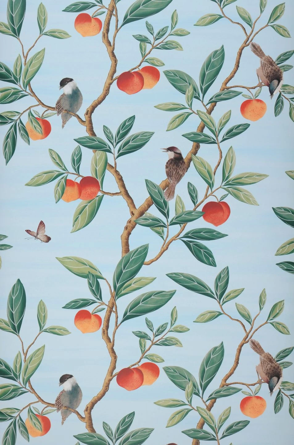 Wie vor einem wolkenlosen Sommerhimmel heben sich die Zweige von Obstbäumen mit Blättern und reifen Früchten und die darauf sitzenden Singvögel vom zartblauen Hintergrund ab. Zwischen den Zweigen flattern einzelne Schmetterlinge durch die sonnendurchflutete Luft. Mit ihrem harmonischen, sonnigen Muster bringt Ihnen Vliestapete Fortuna die Atmosphäre eines warmen Sommertags ins Haus.