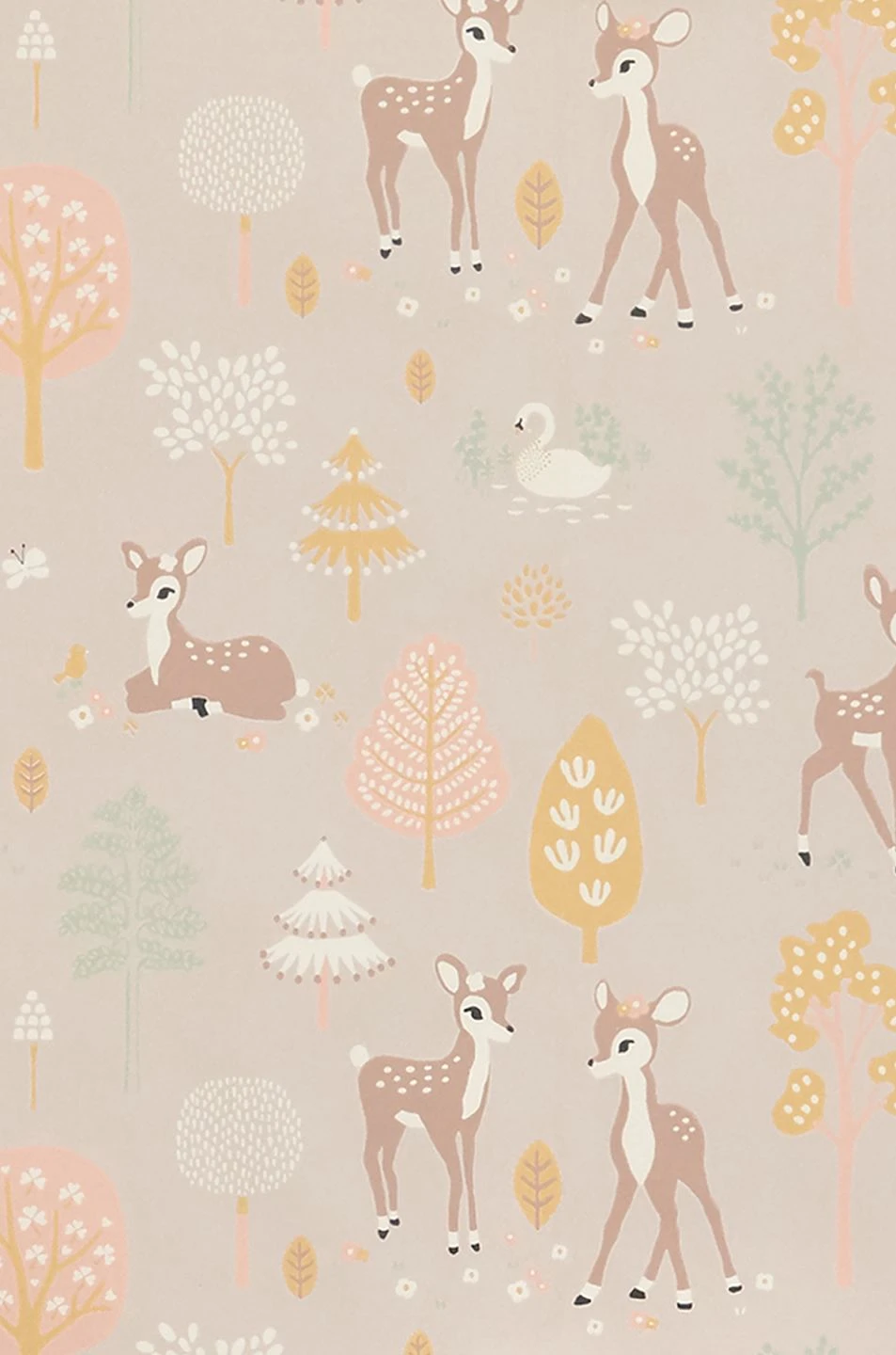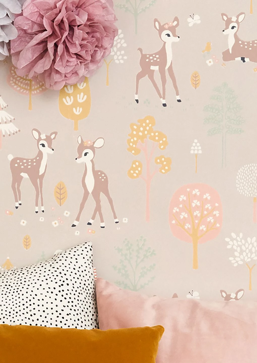 Dass der schwedische Hersteller Majvillan sich voller Herzblut und Einfühlungsvermögen auf Kindertapeten spezialisiert hat, spürt man beim Anblick dieser Vliestapete sofort. Niedliche Rehkitze und Schwäne, Schmetterlinge und Blumen, dazwischen Bäume voller Blüten – „Golden Woods“ kreiert die sonnige Atmosphäre eines lichtdurchfluteten Frühlingswaldes. Anregend und beschützend zugleich wirkt das Design in zarten Rosa, Braun- und Türkistönen.