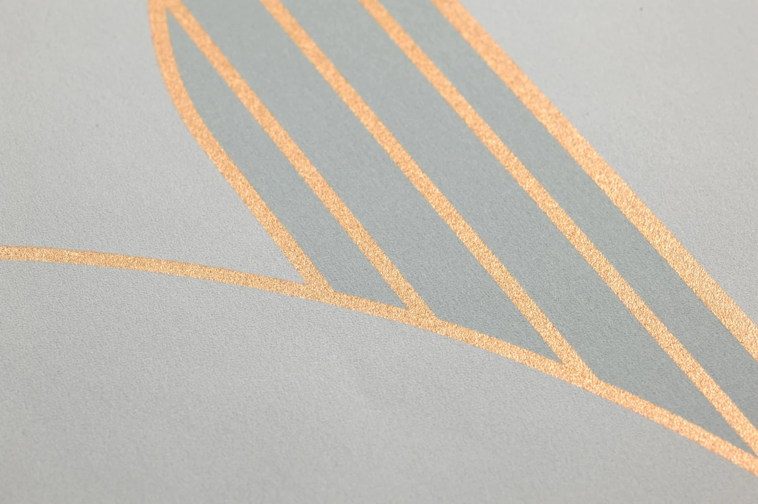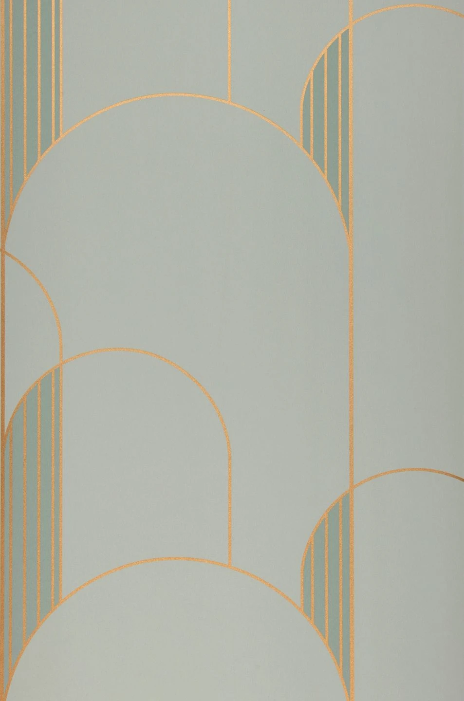 Schlichte Bögen in Zartgrün und Minttürkis werden durch ihre mattgoldenen Umrisse reizvoll betont. Das Bogenmuster stammt aus dem Stil des Art Deco und bildet eine dezente, helle Kulisse mit goldfarbenen Lichtreflexen. Das Oberflächenmaterial der Vliestapete besteht aus Vinyl, ist scheuerbeständig und sogar für die Gestaltung eines eleganten, hellen Badezimmers bestens verwendbar.