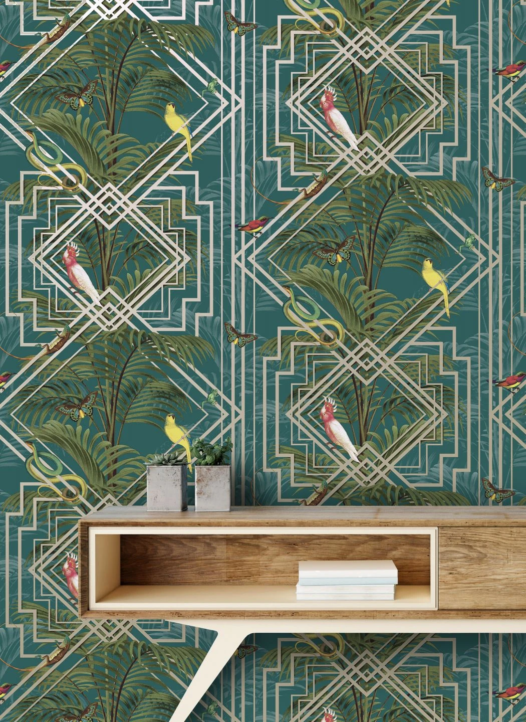 In einer Synthese aus Art Deco und Naturdarstellung kreiert die Papiertapete Grace ihre ganz eigene Ästhetik. Wie an einem Gitter wachsen an den charakteristischen geradlinigen und verwinkelten Ornamenten des Art Deco Palmwedel in die Höhe, realistisch gezeichnete Kakadus und Sittiche sitzen auf den Streifen des Dekors, und Echsen klettern daran. So verschwimmen Vordergrund und Hintergrund, Bildliches und Abstraktes zu einer phantastischen Welt.