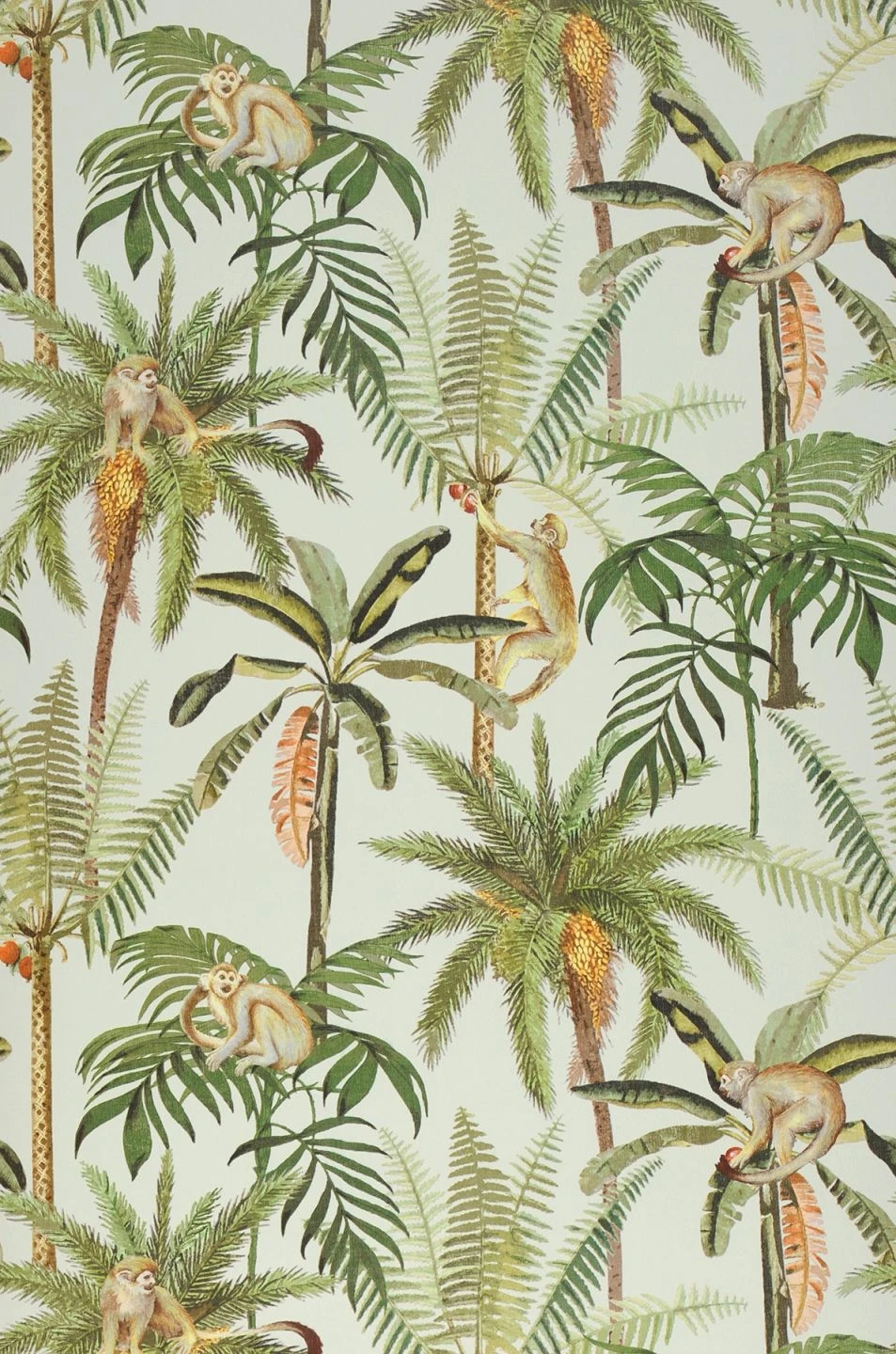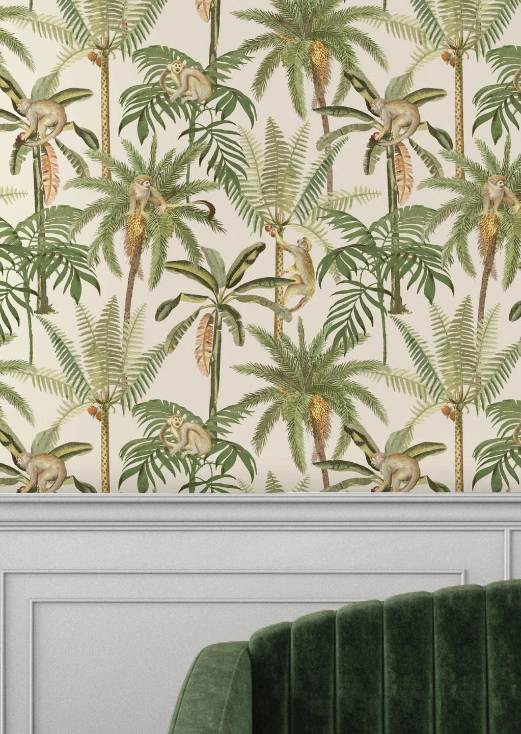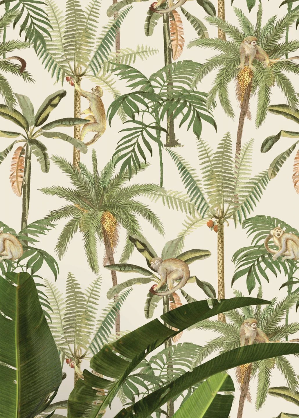 Helle, freundliche Grün- und Beigetöne stehen im Mittelpunkt in den realistischen Darstellungen von Palmen und Äffchen, die auf dieser Vliestapete für exotisches Ambiente sorgen. In Verbindung mit dem grauweißen Hintergrund schaffen sie einen lichtdurchfluteten Raum, während die niedlichen Totenkopfäffchen jedem Betrachter ein Lächeln ins Gesicht zaubern. Kombiniert mit Weiß oder Holztönen ergibt sich ein unverwechselbarer Raumeindruck.