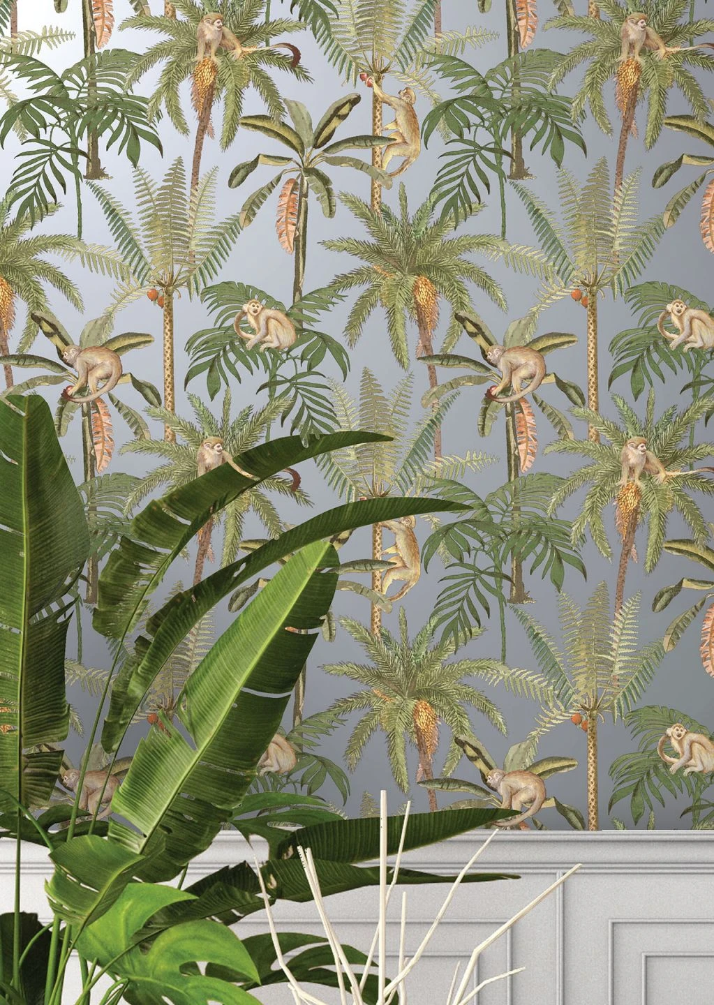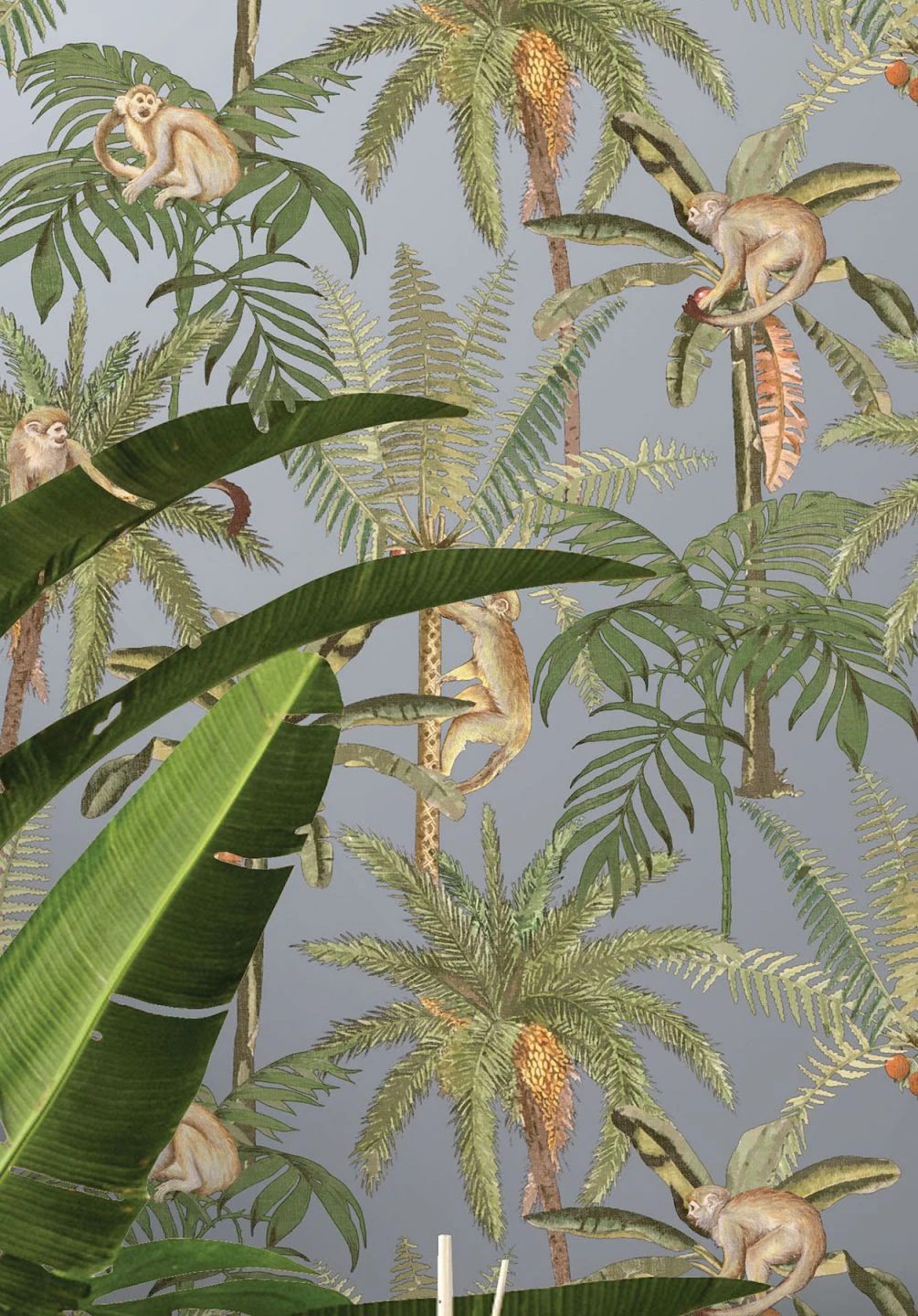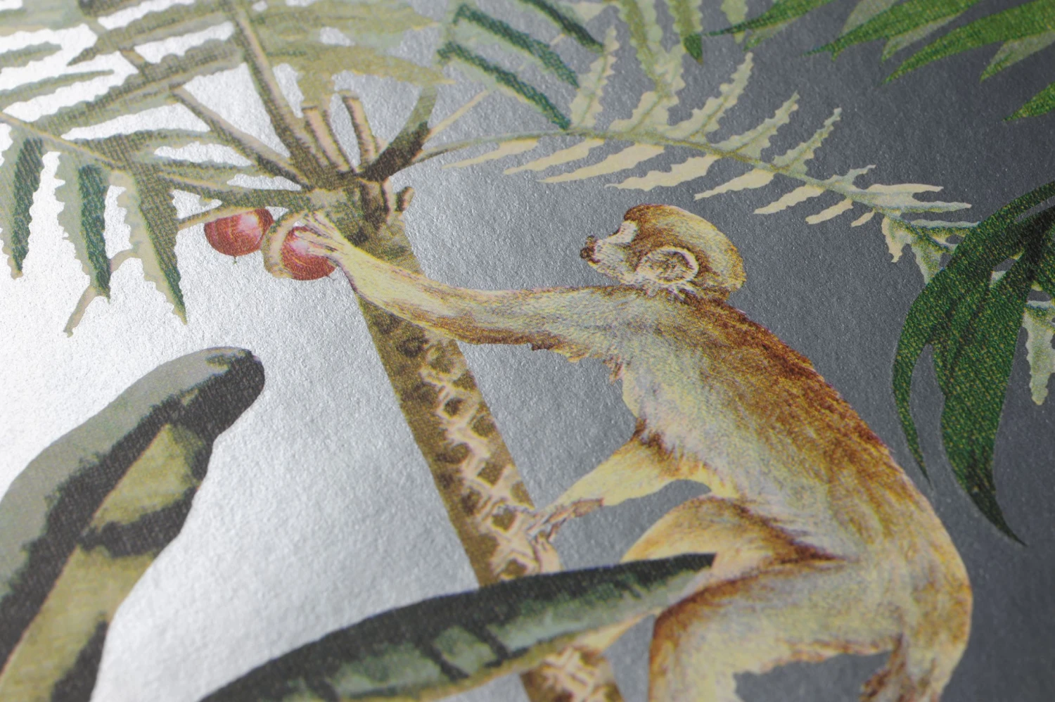 Exotisches Flair bringt die Vliestapete „Greenery“ mit sich. Die realistisch wirkenden Darstellungen von Totenkopfäffchen und verschiedenen Palmen mit ihren reifen Früchten sorgen für das Gefühl tropischer Wärme. Von dem glänzend silberfarbenen Hintergrund heben sich die Pflanzen und Tiere deutlich ab. Die Tapete schmückt ein anregendes Kinderzimmer, aber ebenso schön einen individuellen Hobbyraum.