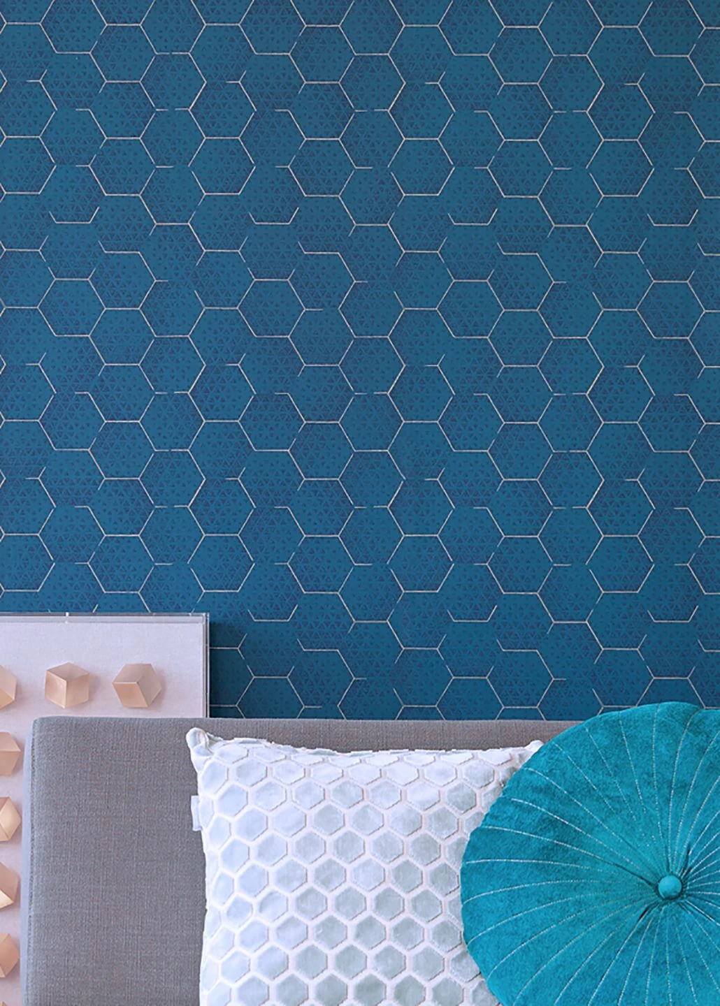Aus zwei fein aufeinander abgestimmten Blautönen entstehen kleine Dreiecke, die die Flächen innerhalb der goldfarben eingefassten Sechsecke angenehm strukturieren. Das tiefe Dunkelblau und das Grünblau gehen mit dem Gold eine ästhetische Verbindung ein, die an Kacheln orientalischer Paläste erinnert. Die Vliestapete lässt sich mit Gold- und Blautönen oder auch Weiß in Ihrer Einrichtung herrlich kombinieren.