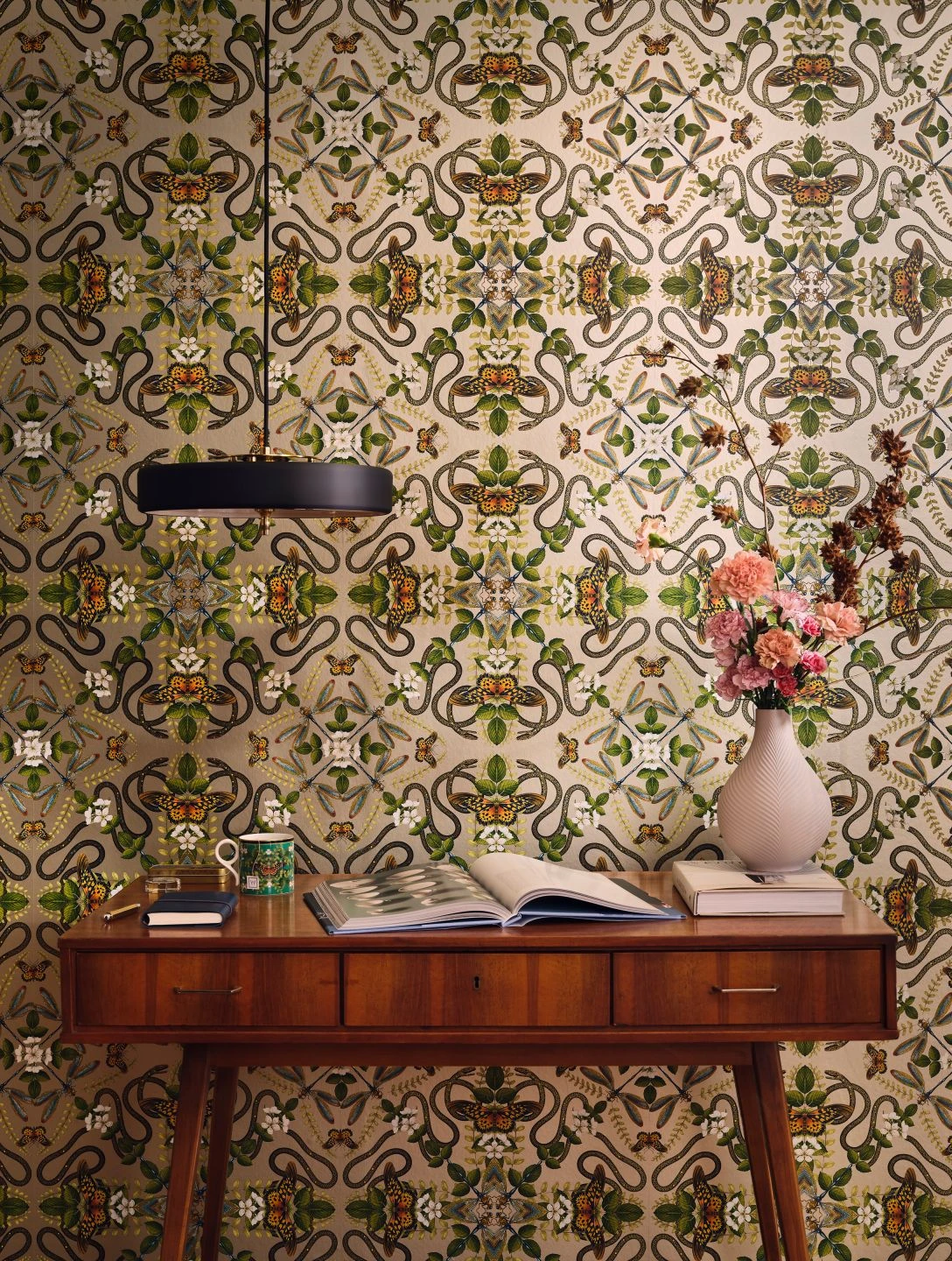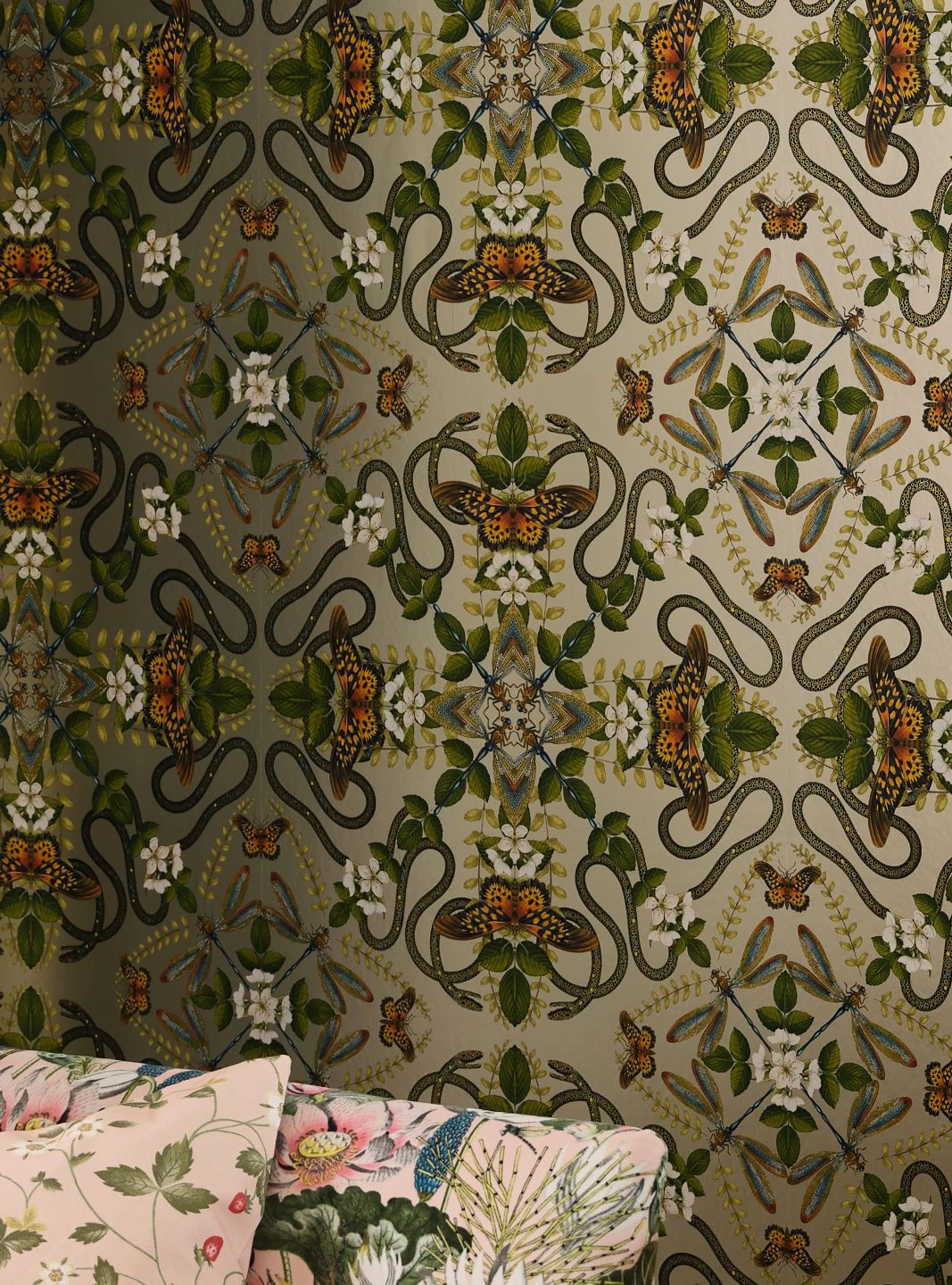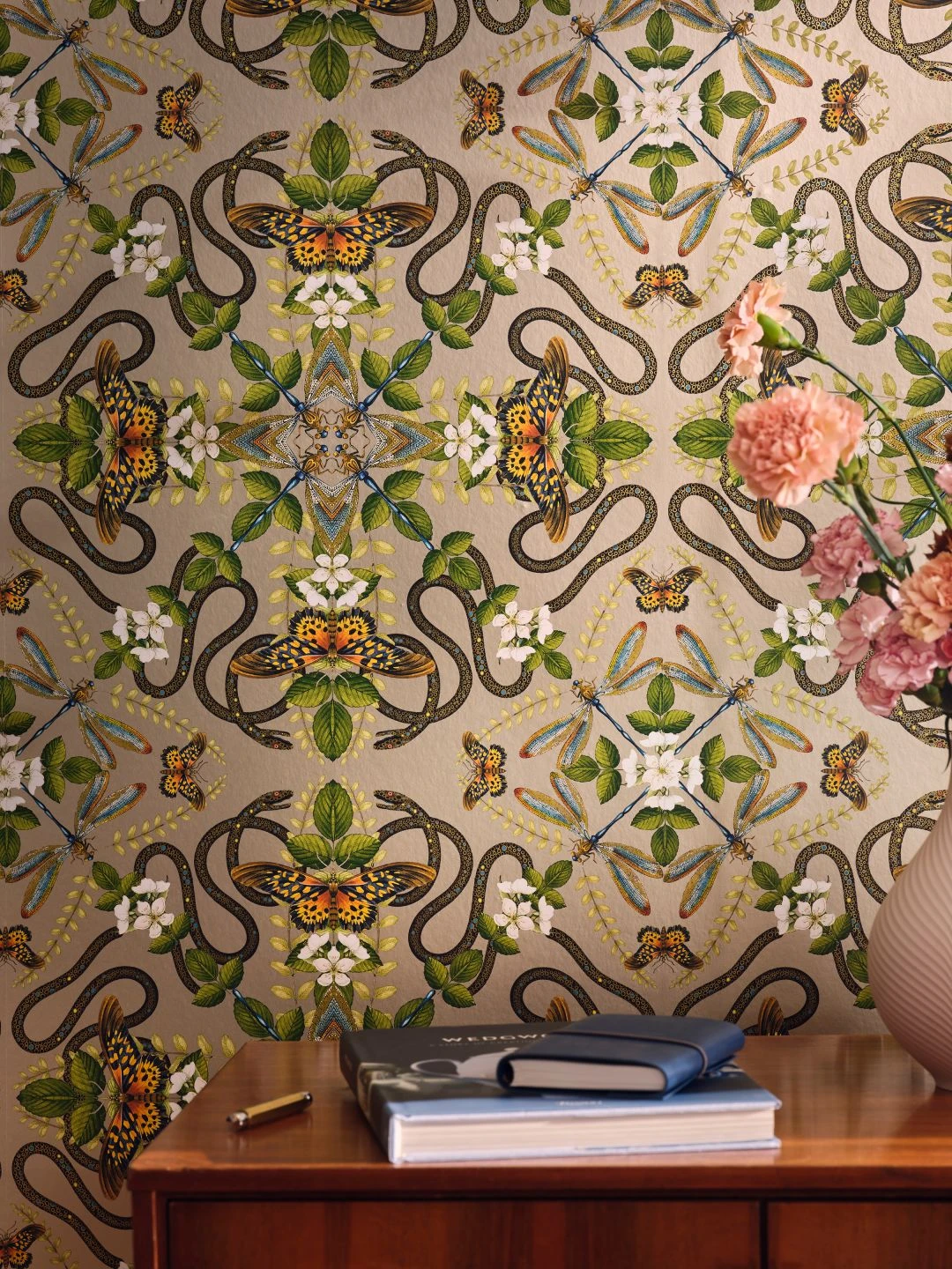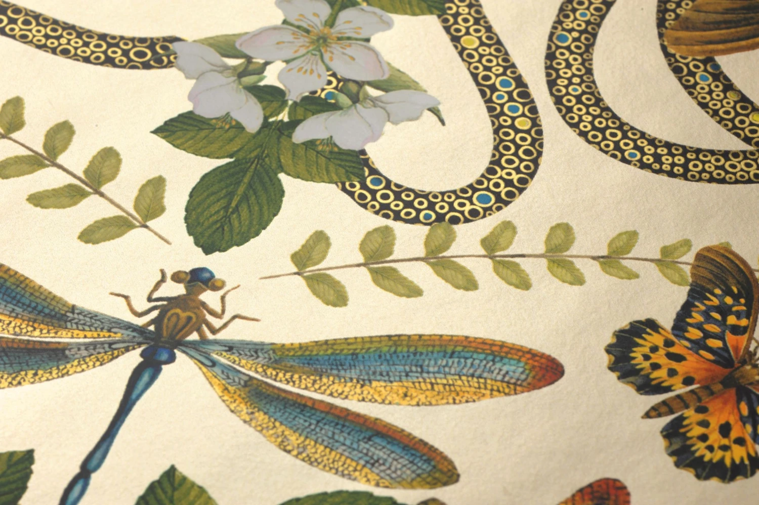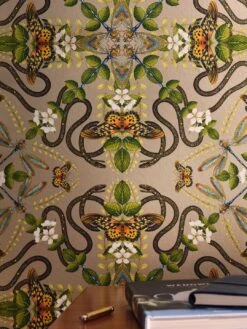 Was auf den ersten Blick wie ein barockes Tapetenmuster aus stilisierten Ornamenten wirkt, entpuppt sich bei näherem Hinsehen als raffiniertes Arrangement naturgetreu dargestellter Tiere und Pflanzen. In perfekter Symmetrie finden sich Schmetterlinge und Libellen, Schlangen, Blüten und Blattranken. In Verbindung mit dem perlbeigefarbenen Grund wirkt Vliestapete Hakama edel und gleichzeitig extravagant.