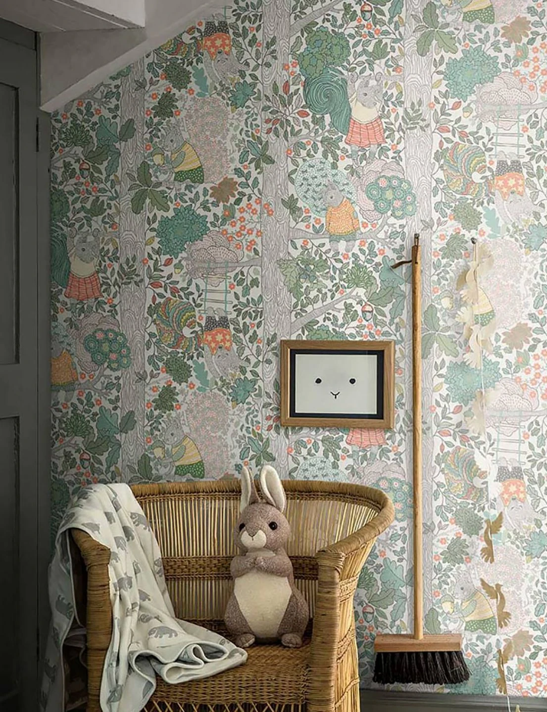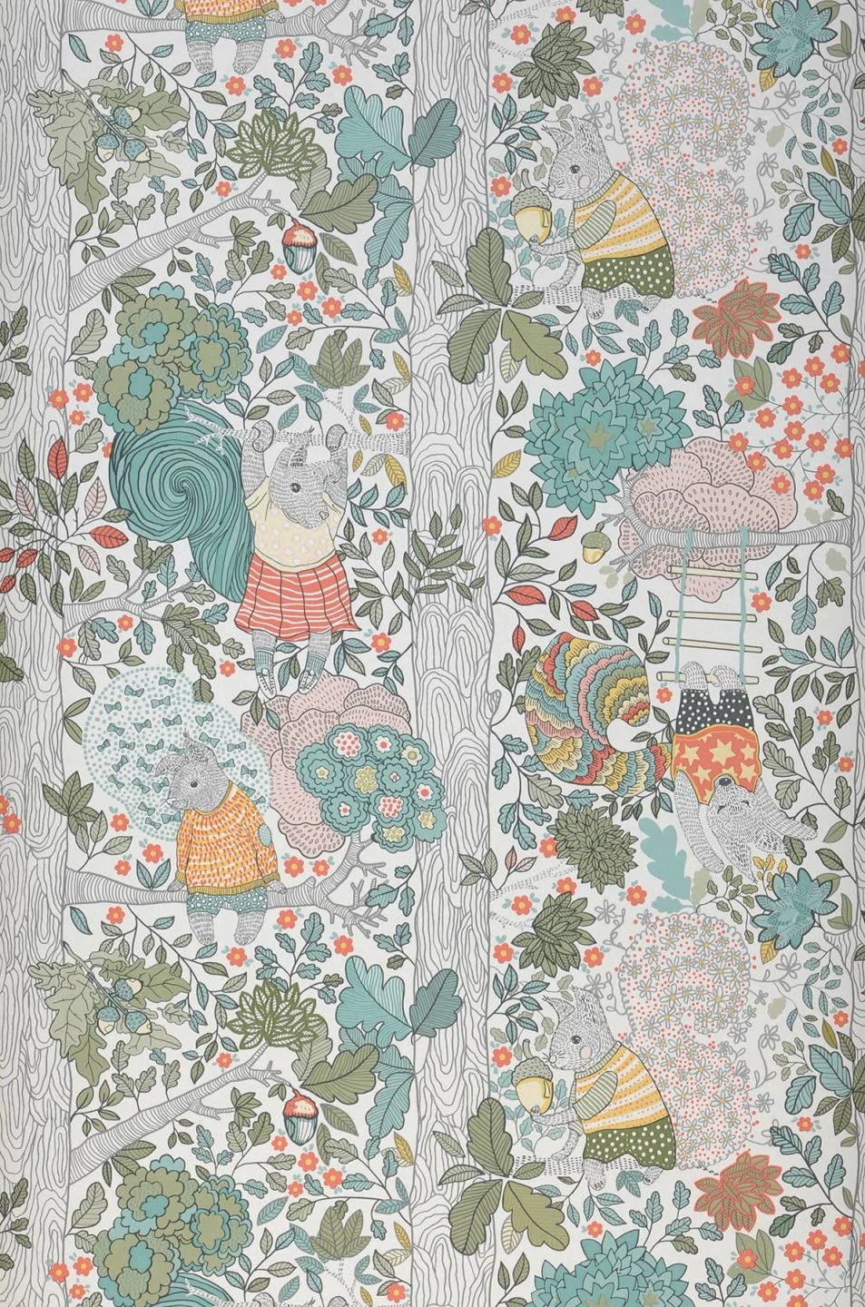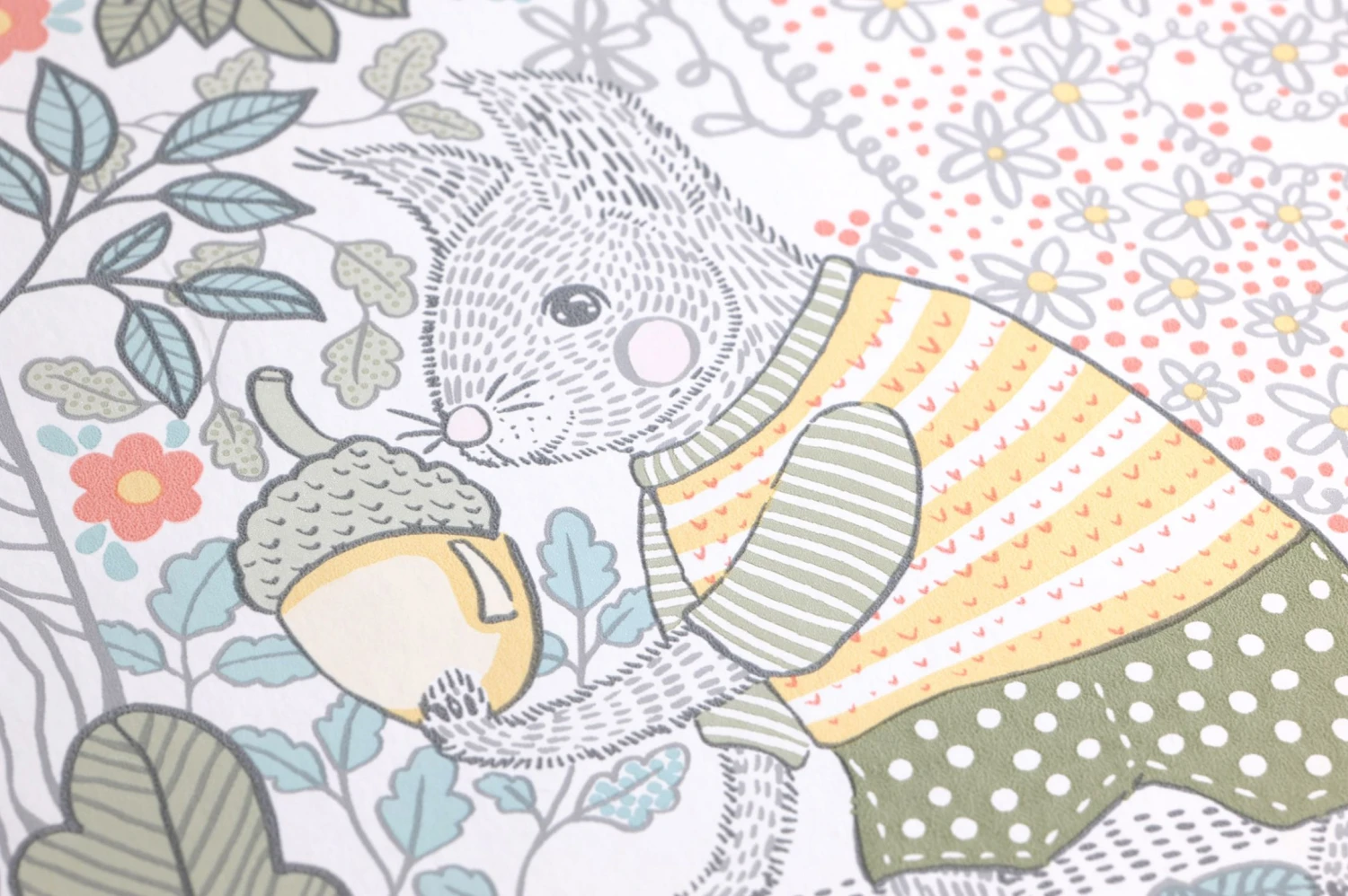 Viel Phantasie und Liebe zum Detail ist das Design der Kindertapete „Haval“ eingeflossen. In einer angedeuteten Landschaft voller Bäume, Büsche und Blumen spielen Eichhörnchen, hangeln an Ästen, klettern auf Strickleitern und sammeln Eicheln ein. Mit ihrer niedlichen Kleidung wirken sie wie spielende Kinder, mit denen sich Ihr Kind sofort identifizieren kann. Für eine märchenhaft-bunte Note sorgen die farbenfrohen buschigen Schweife der Tiere.