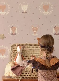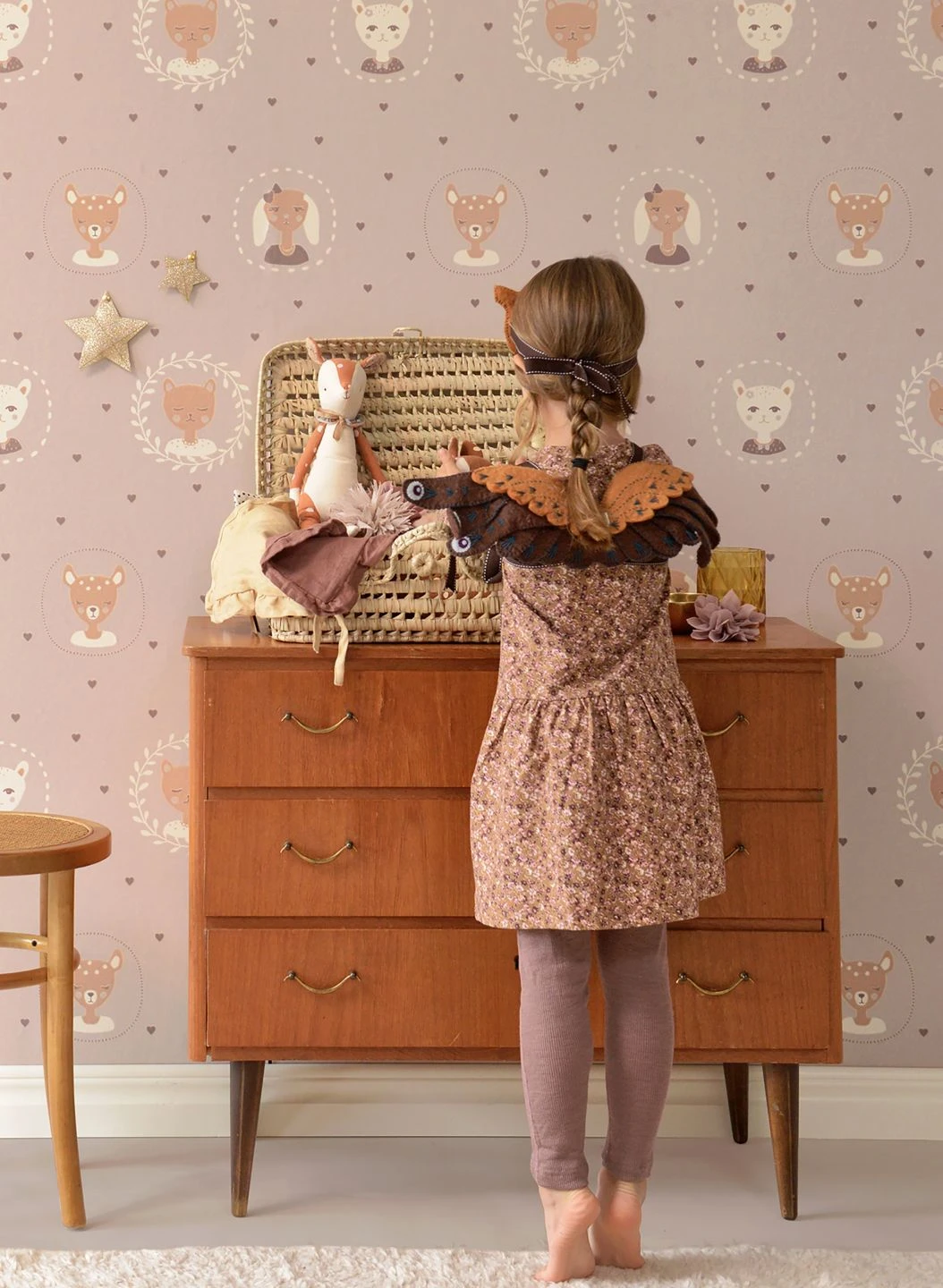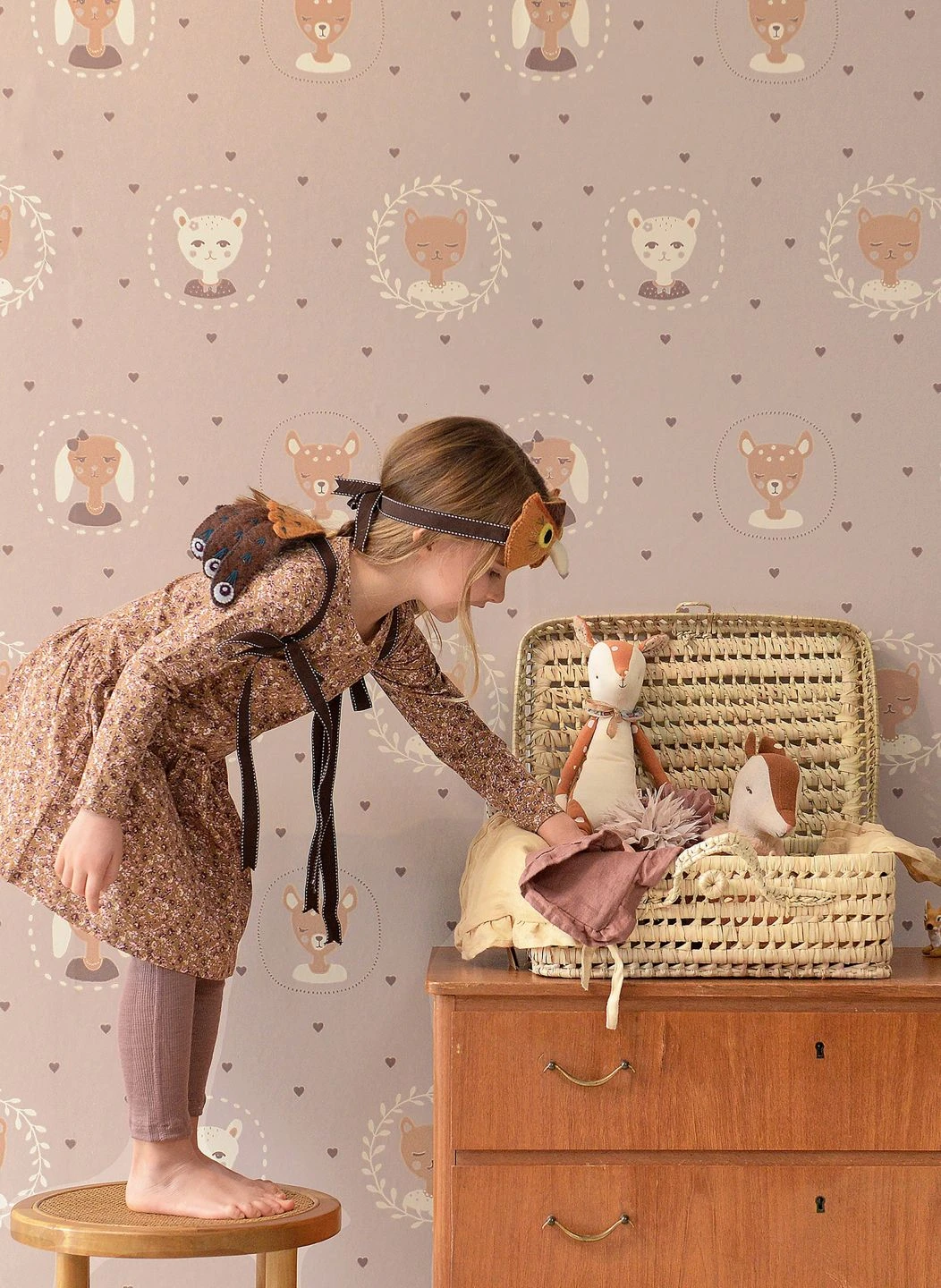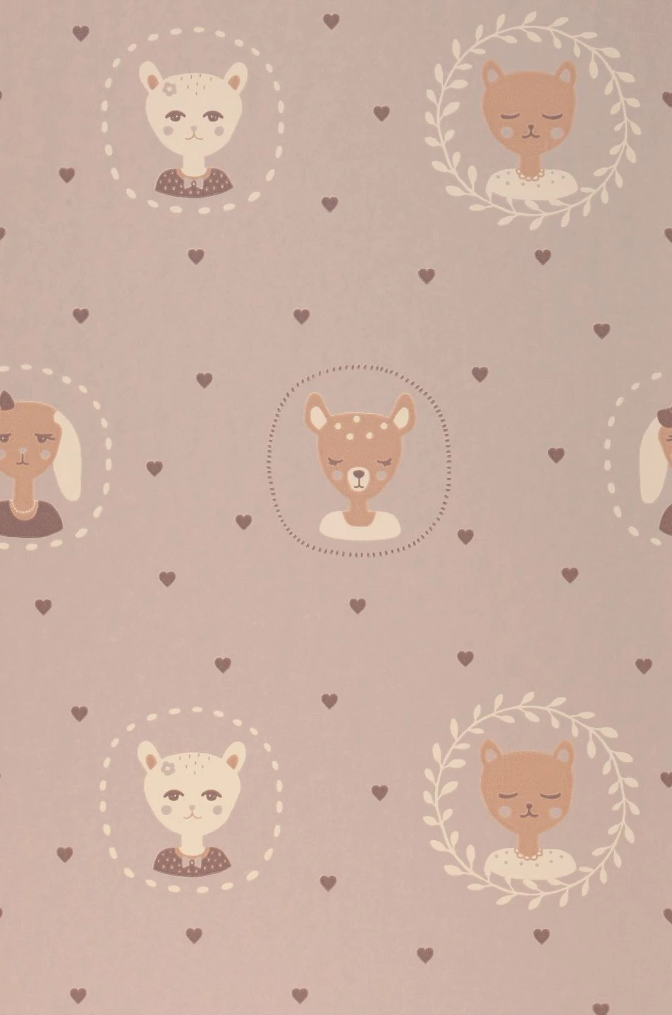 Niedliche Tiergesichter, liebevoll gezeichnet wie in einem Bilderbuch und umrahmt von zart gemusterten Borten, machen das Kinderzimmer zu einem freundlichen Ort der Geborgenheit. Der hellgrauviolette Grund der im Leimdruckverfahren hergestellten Vliestapete von Majvillan ist durch unzählige kleine Herzen belebt. Das Design beschränkt sich auf wenige Farbtöne wie Braunbeige, Cremeweiß und Schokoladenbraun und kreiert mit dem Hellgrauviolett des Grunds eine harmonische Kulisse.
