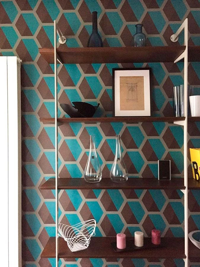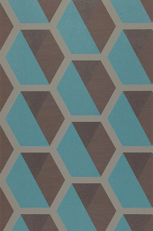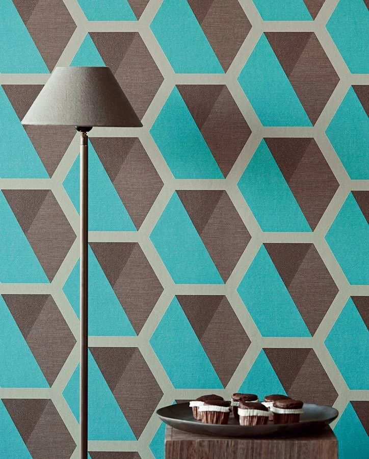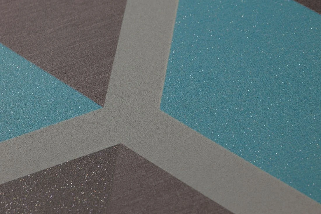 Die Sechsecke sind wie Bienenwaben angeordnet und erzeugen durch das Schattenspiel der Farben Grau, Braun und Türkis einen dreidimensionalen Eindruck. Das zarte Glitzern erhöht den Wohlfühlcharakter.