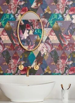 Eine Tapete wie der Blick durch ein Prisma: Farblich abgestufte Dreiecke, Rauten und Trapeze liegen über dem üppigen Blumenmuster und rufen einen leicht verfremdenden Effekt hervor. Die verwendeten Farben sind so perfekt aufeinander abgestimmt, dass die bunten Töne und Grenzflächen bei aller Lebhaftigkeit den Gesamteindruck harmonischer Ästhetik hinterlassen. „Imaginario“ hebt das Konzept der geblümten Tapete auf ein neues Niveau.